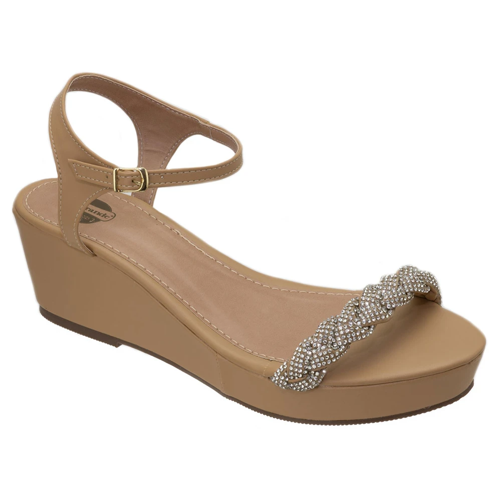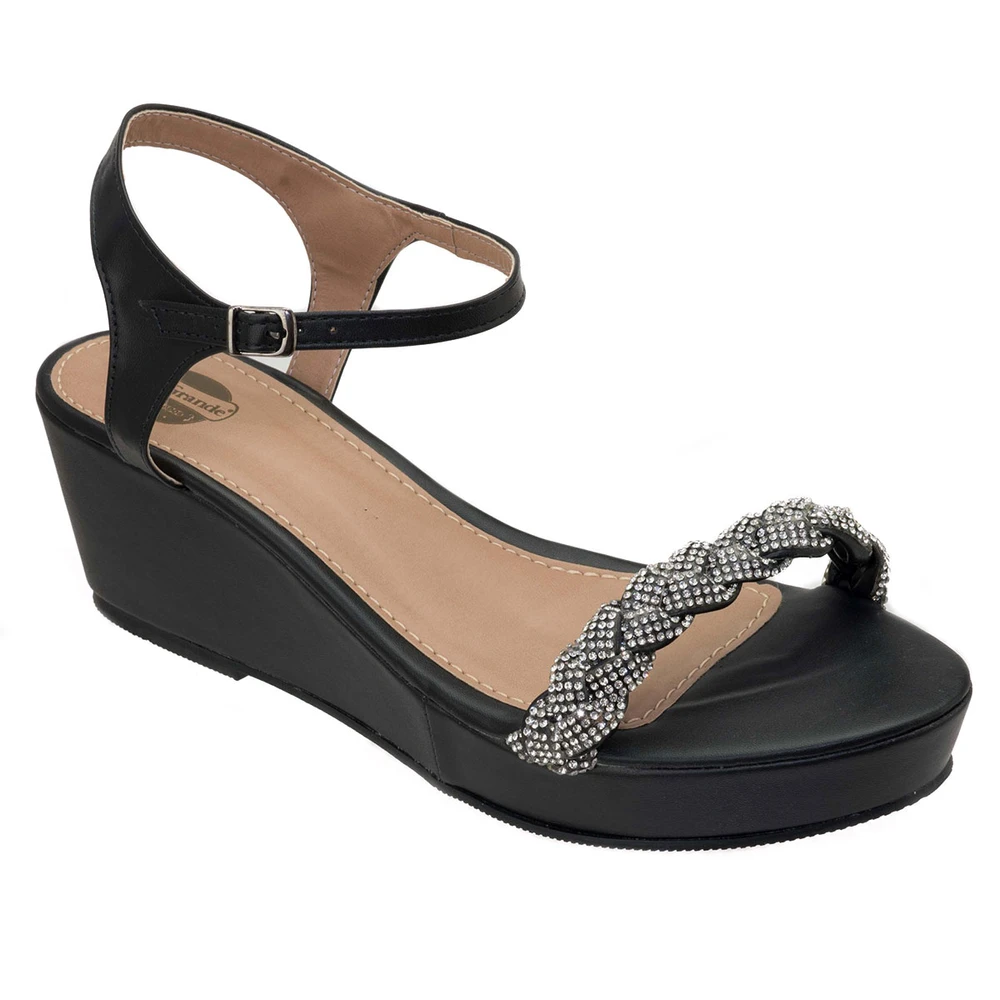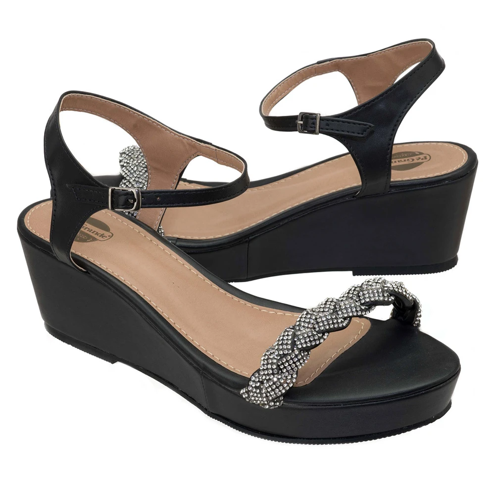 Sandália plataforma em laminado sintético com salto de 2,5 cm na frente e 7,5 cm atrás com solado em borracha antiderrapante.