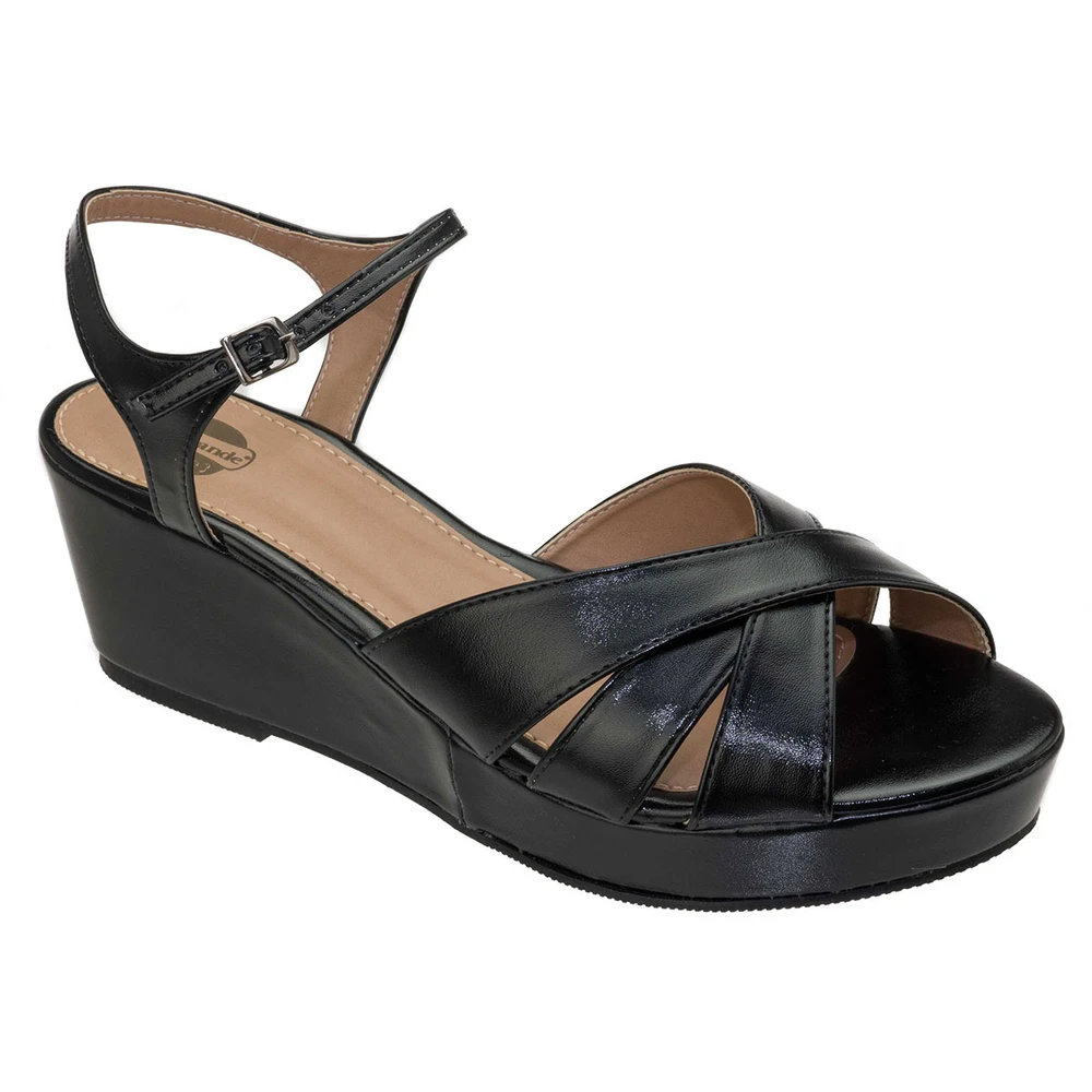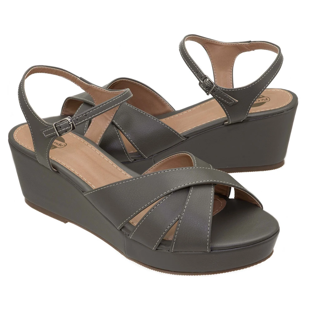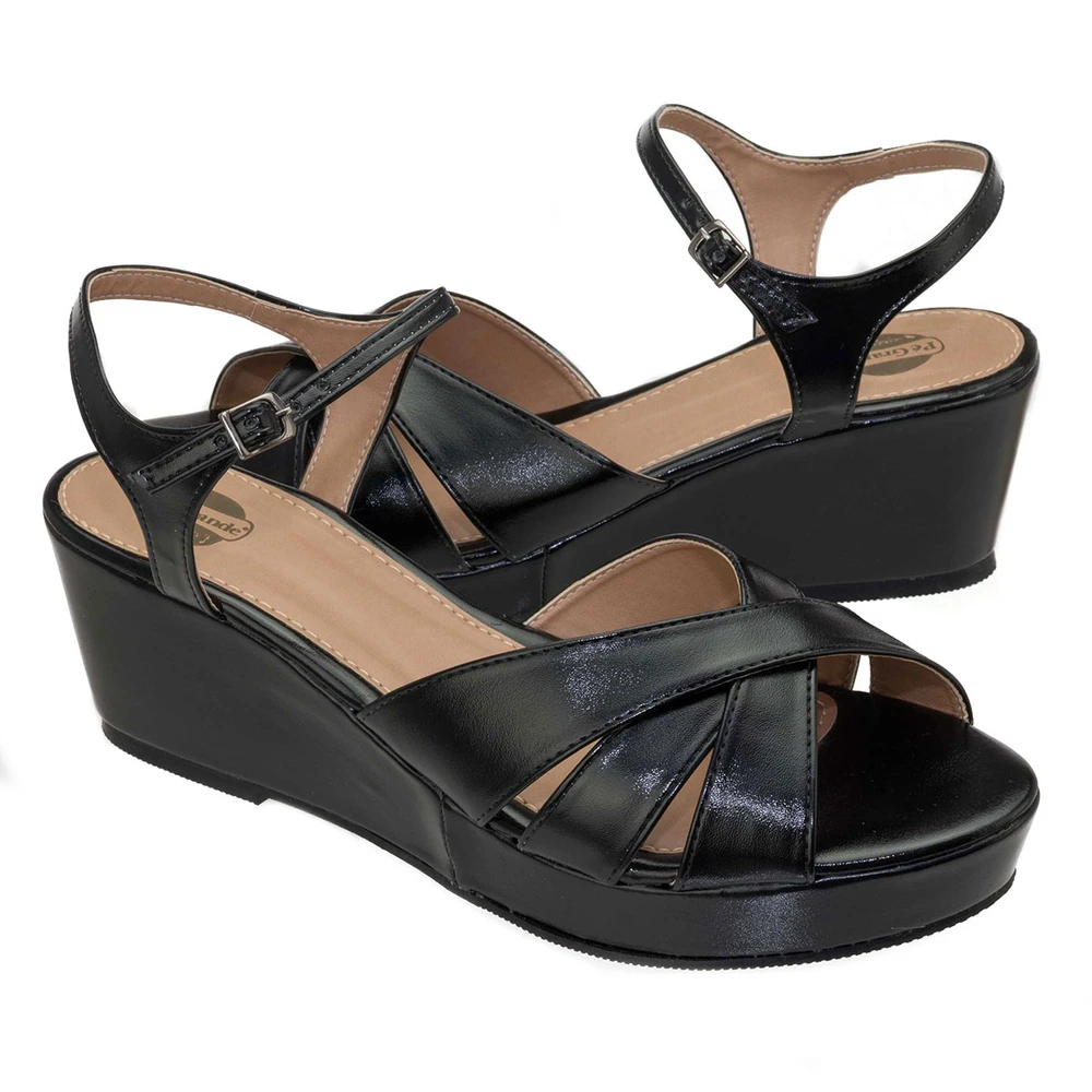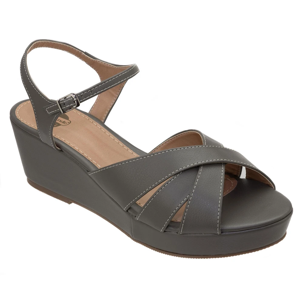 Sandália plataforma em laminado sintético com salto de 2,5 cm na frente e 7,5 cm atrás com solado em borracha antiderrapante.