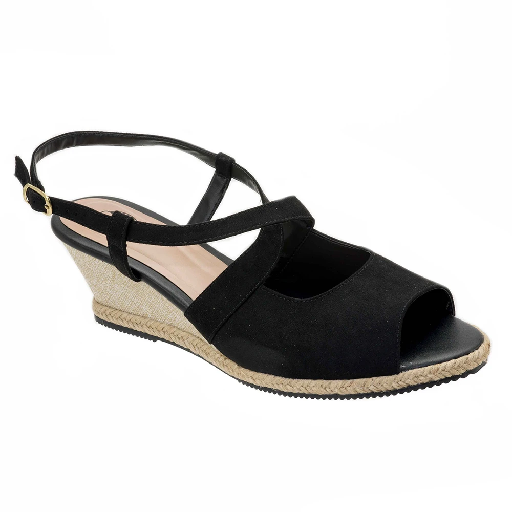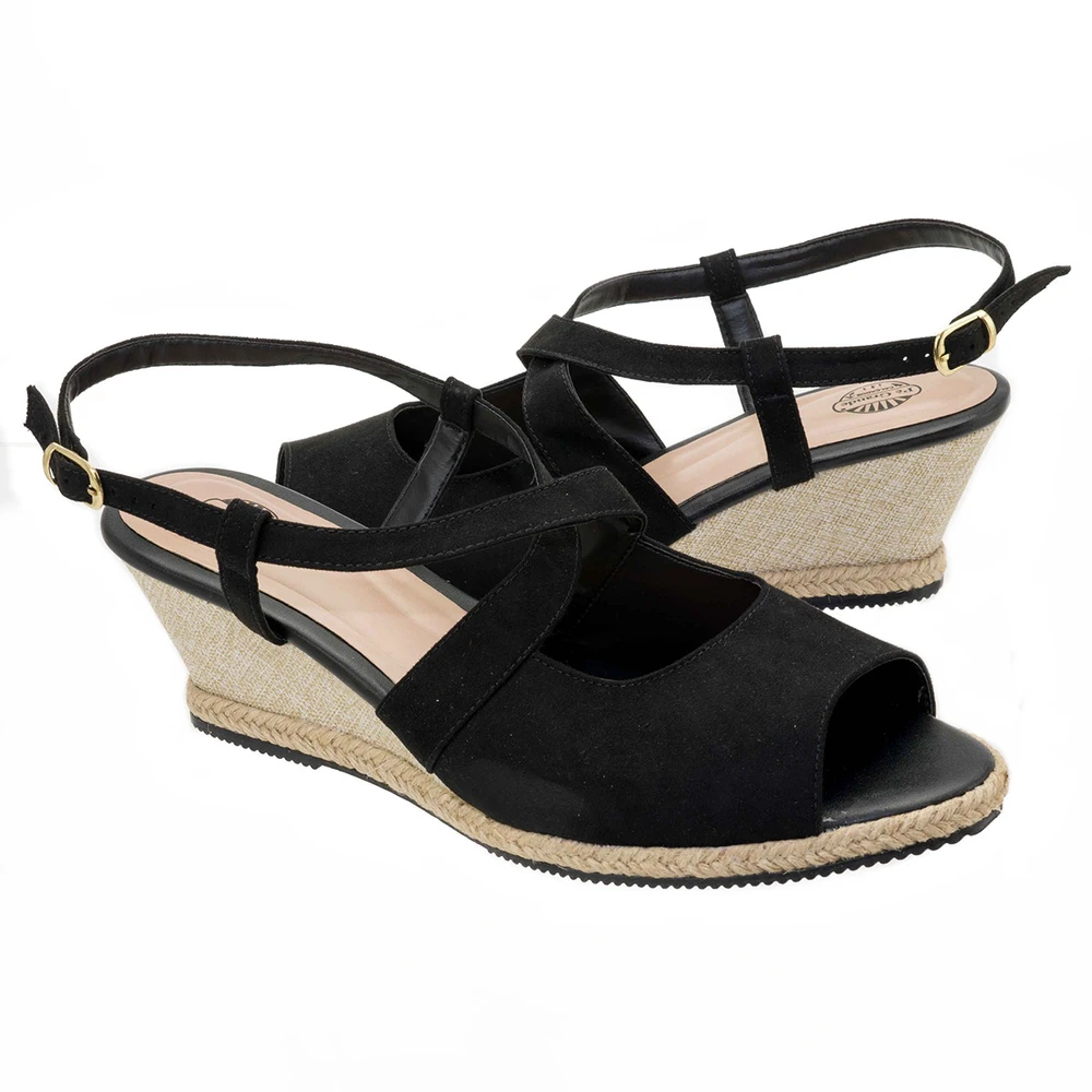 Sandália em elástico, com salto anabela de 7,5 cm de altura e sola emborracha.