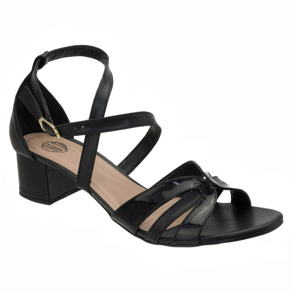 Sandália em laminado sintético, com salto de 5 cm de altura e sola emborracha.