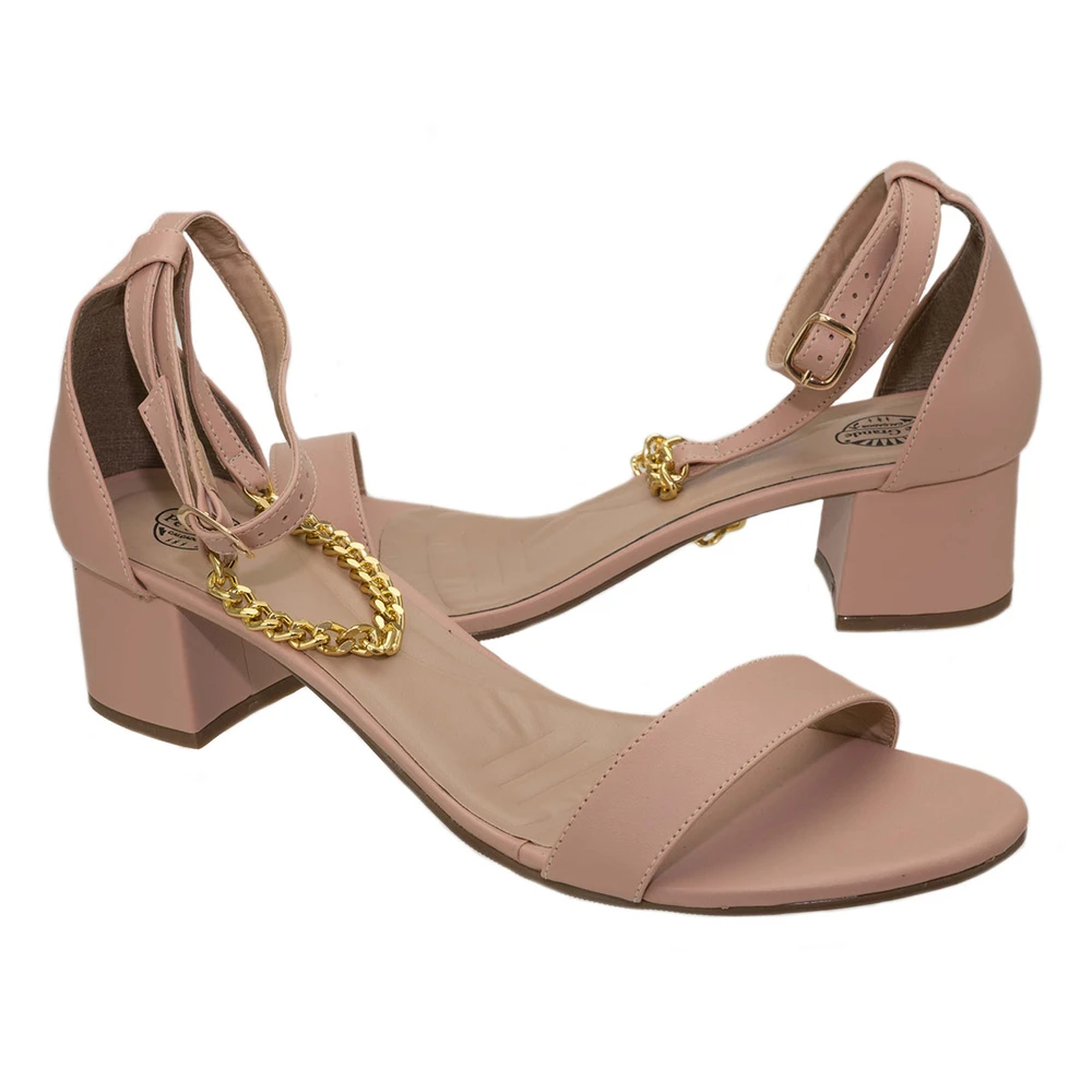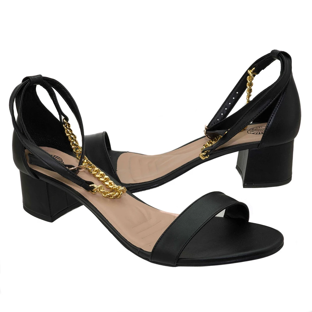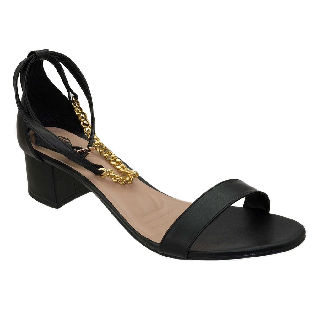 Sandália em laminado sintético, com salto de 5 cm de altura e sola emborracha.