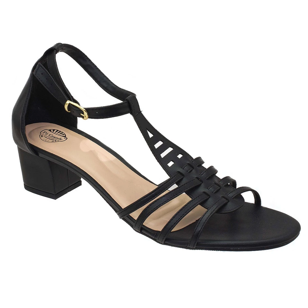 Sandália em laminado sintético, com salto de 5 cm de altura e sola emborracha.