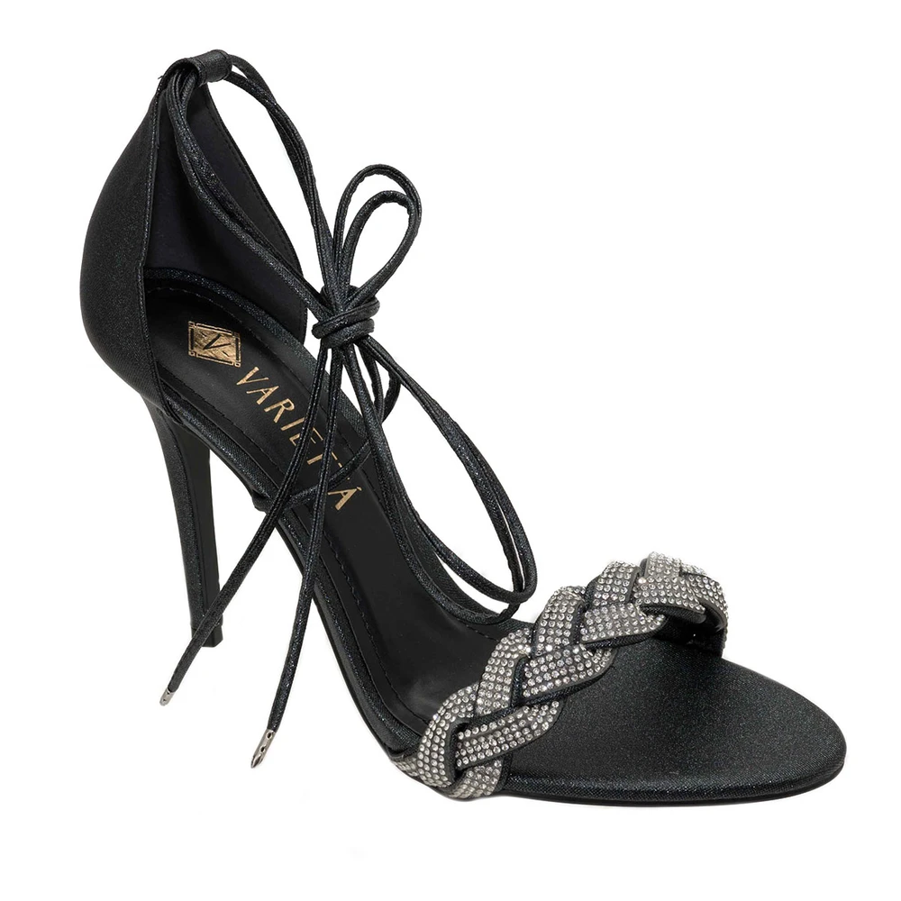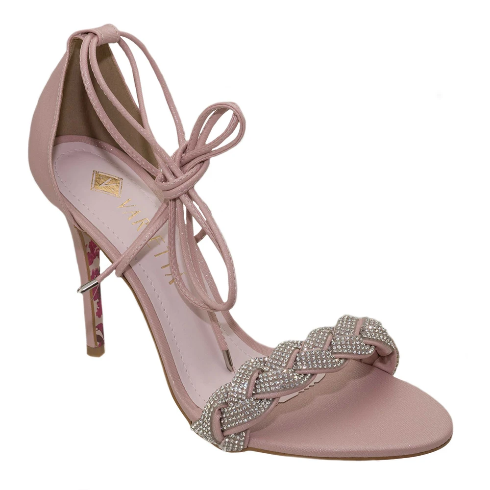 Sandália em laminado sintético com saltinho fino de 12 cm de altura e solado em borracha antiderrapante. Com lindo aplique de strass.