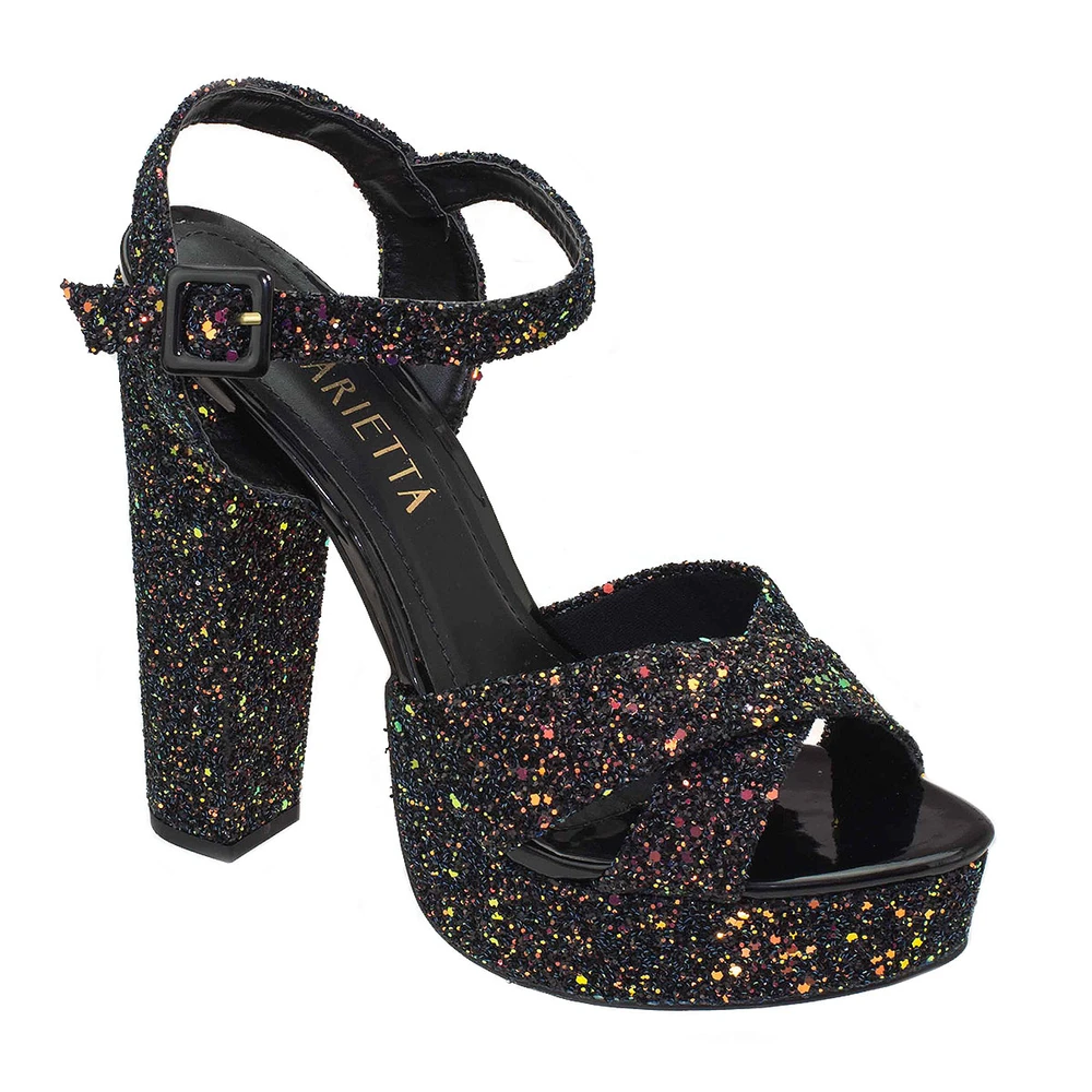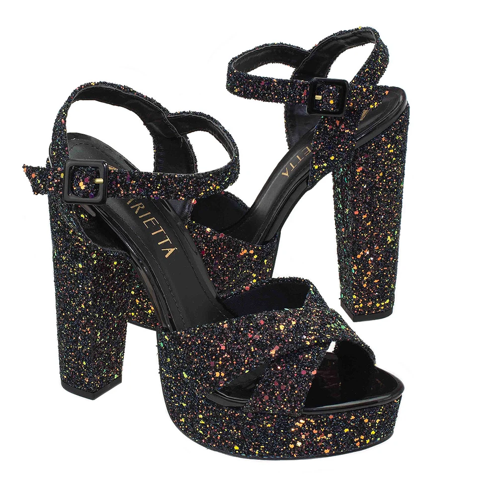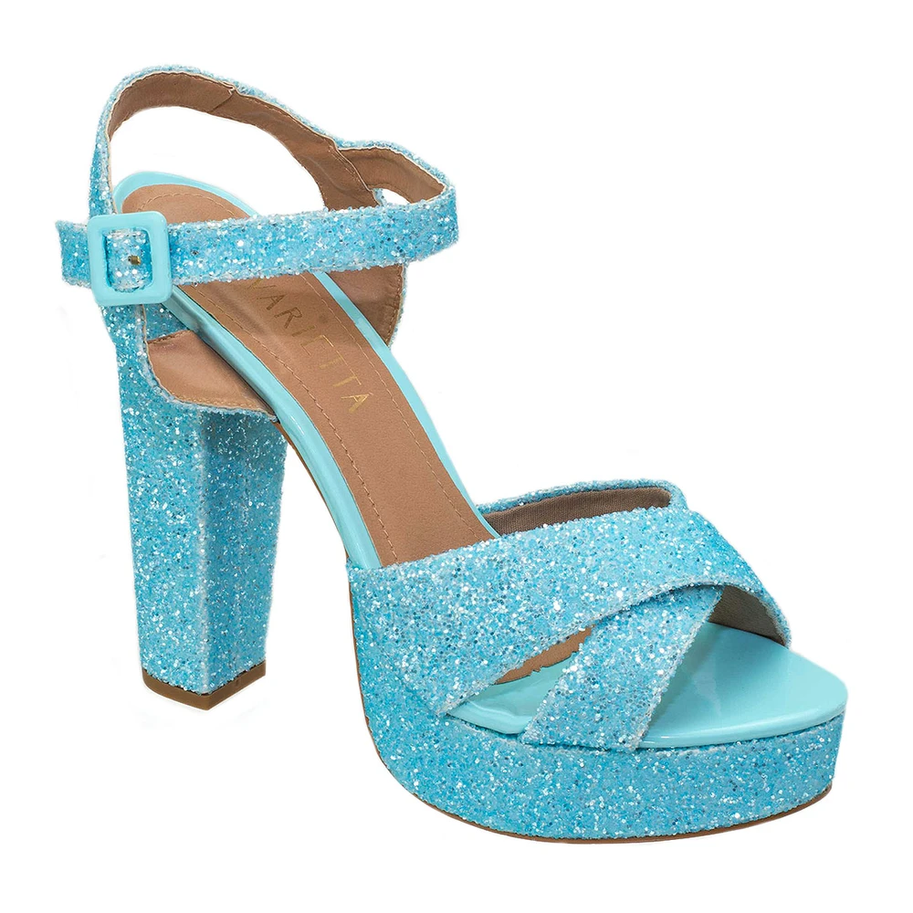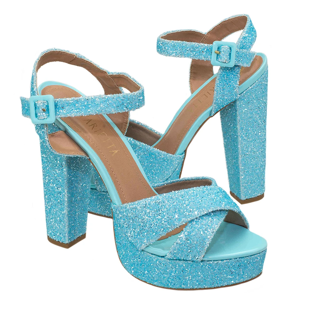 Sandália em laminado sintético, com salto grosso de 15,5 cm de altura e solado em borracha antiderrapante.
