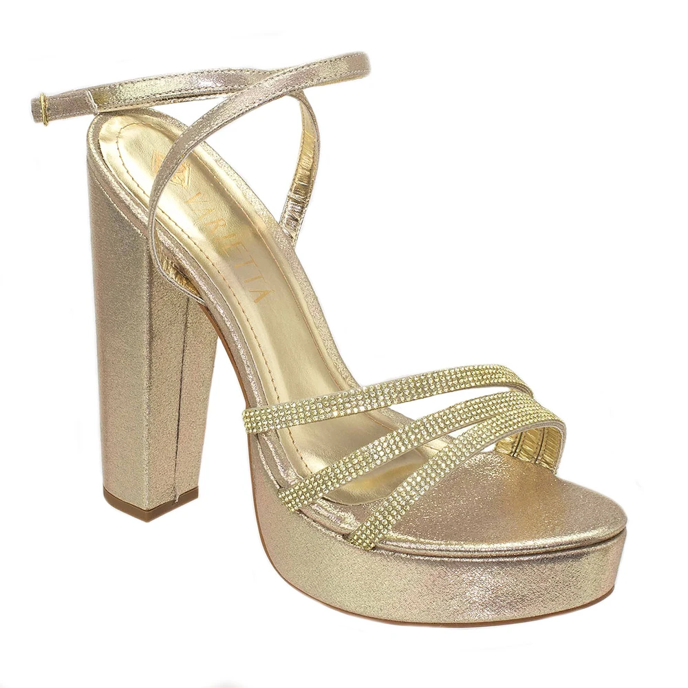 Sandália em tecido e couro com salto grosso de 16 cm de altura e solado em borracha antiderrapante.