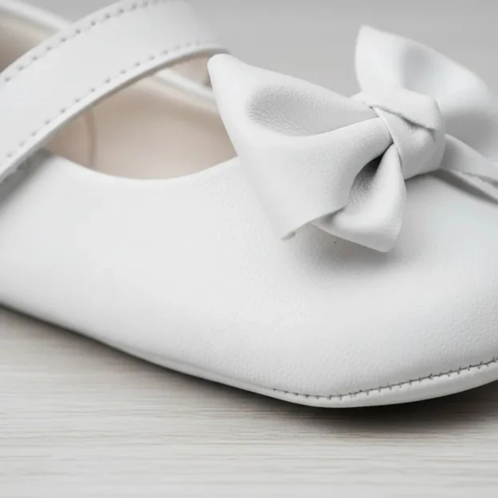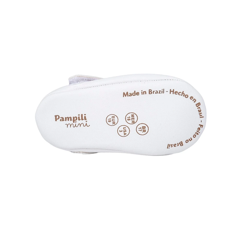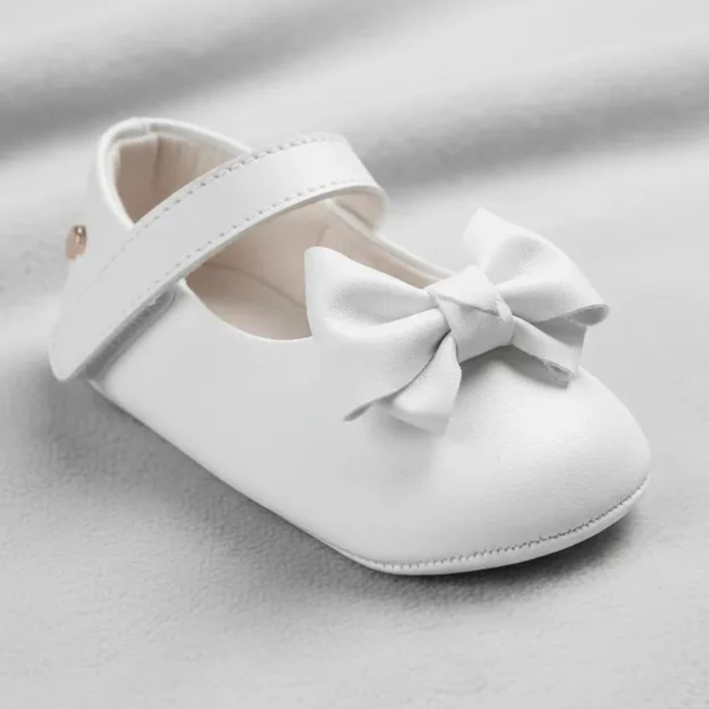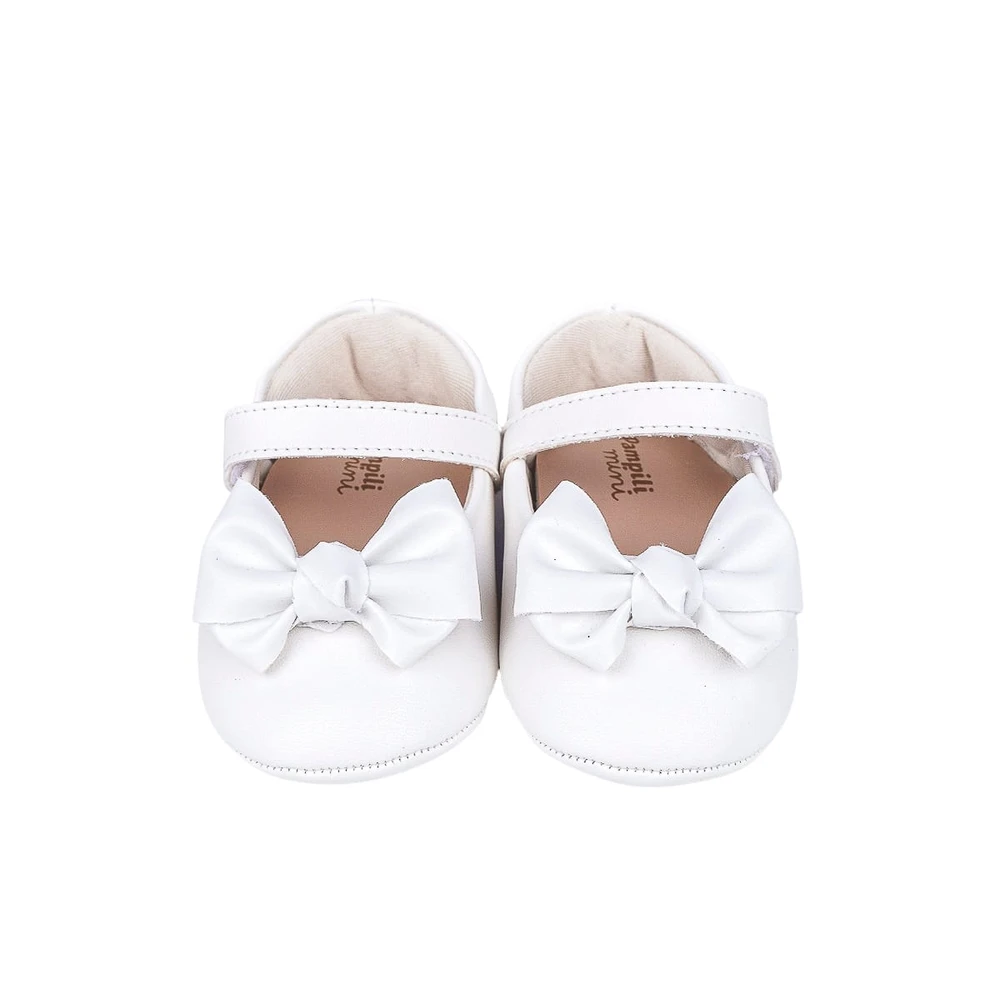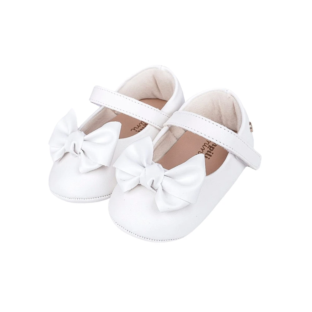 Sapato de bebê feminino em sintético branco com laço adornado! Sapato com forro em tecido que auxilia na absorção do suor e espuma para acolher e cuidar dos pezinhos sem interferir no desenvolvimento natural. Sapato infantil flexível com calce fácil, facilitando o dia a dia da mamãe!