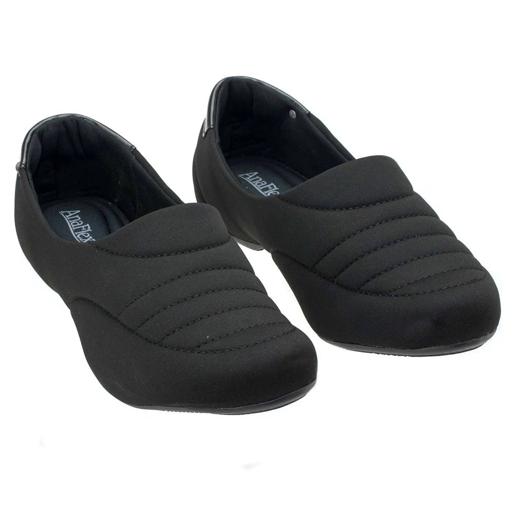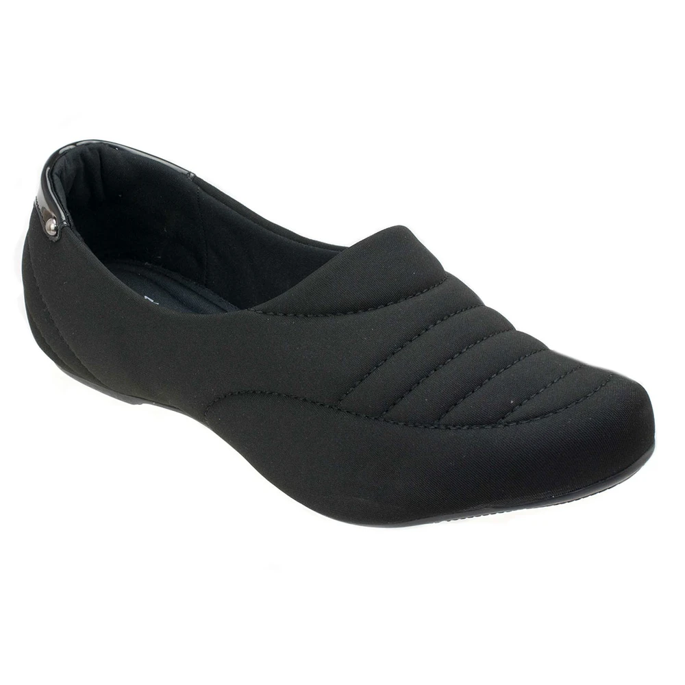 Sapato em laminado sintético sem salto, e solado em borracha antiderrapante.