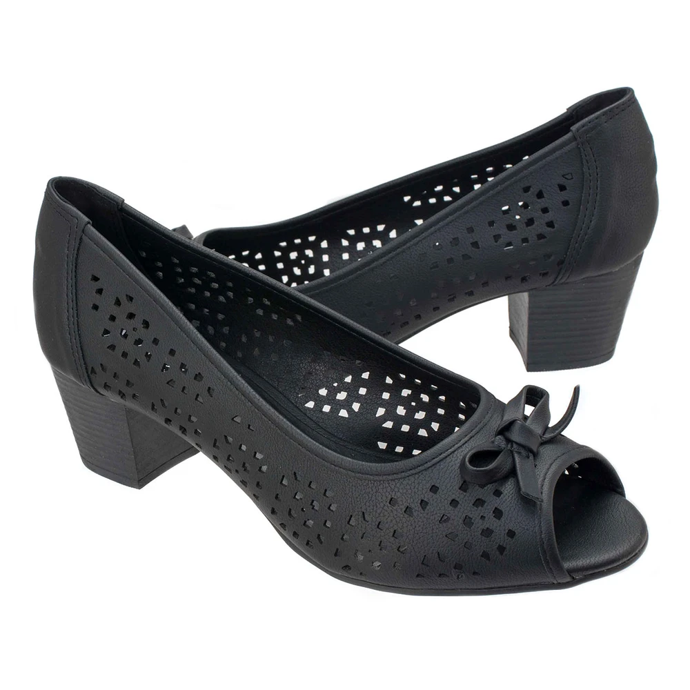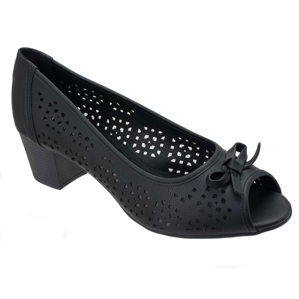 Sapato em laminado sintético com saltinho de 5, 5 cm de altura, e solado em borracha antiderrapante.