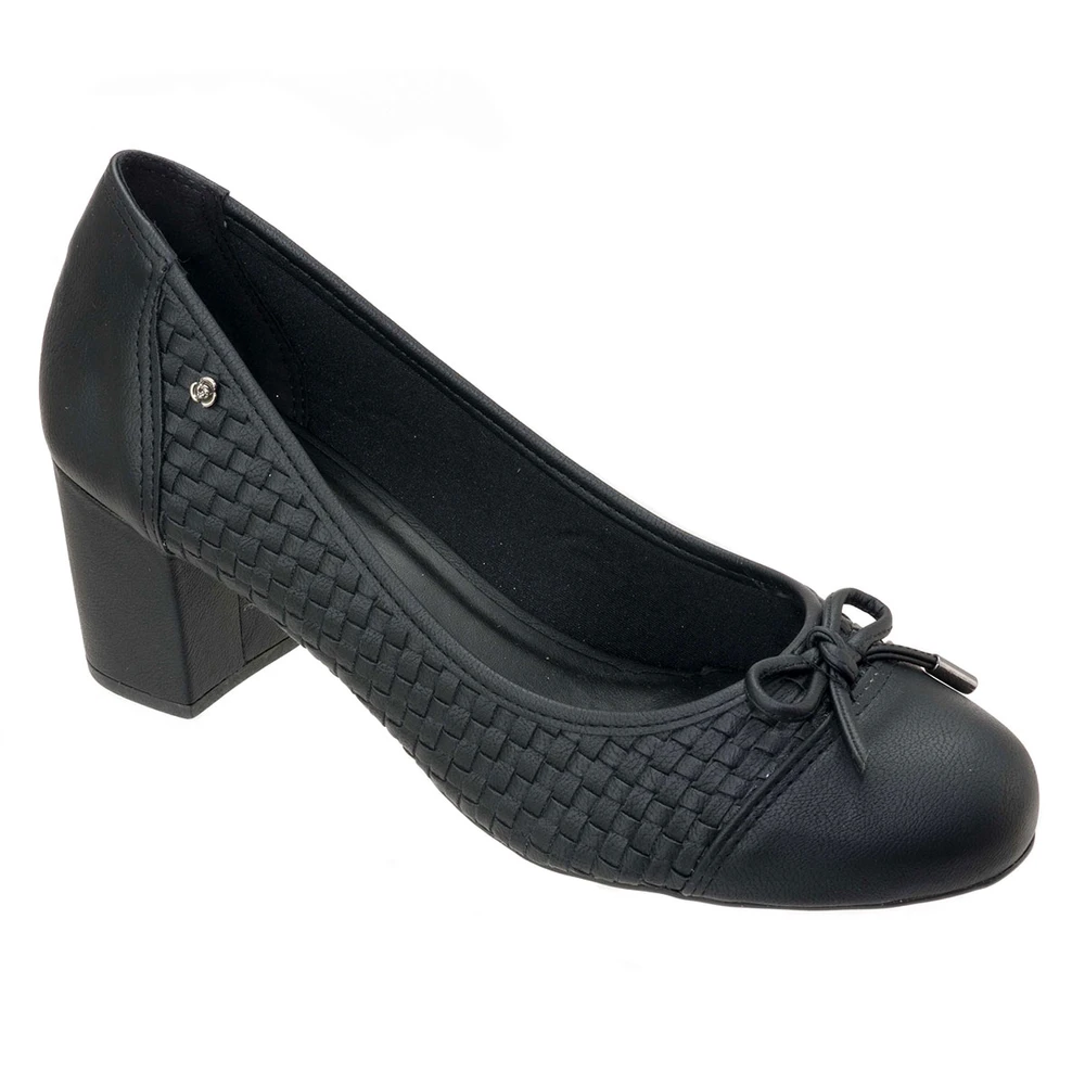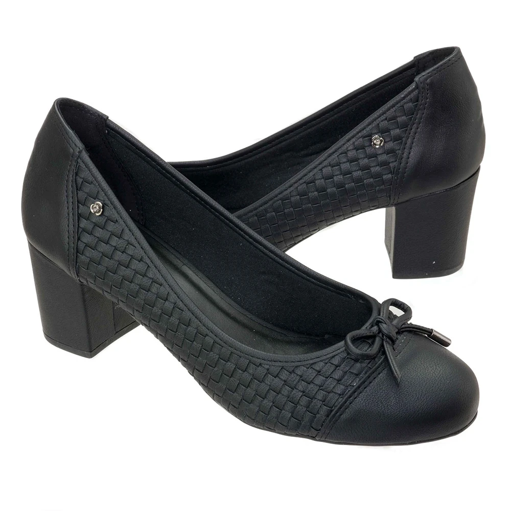Sapato em couro ecológico em saltinho grosso de 7 cm de altura e solado em borracha antiderrapante.