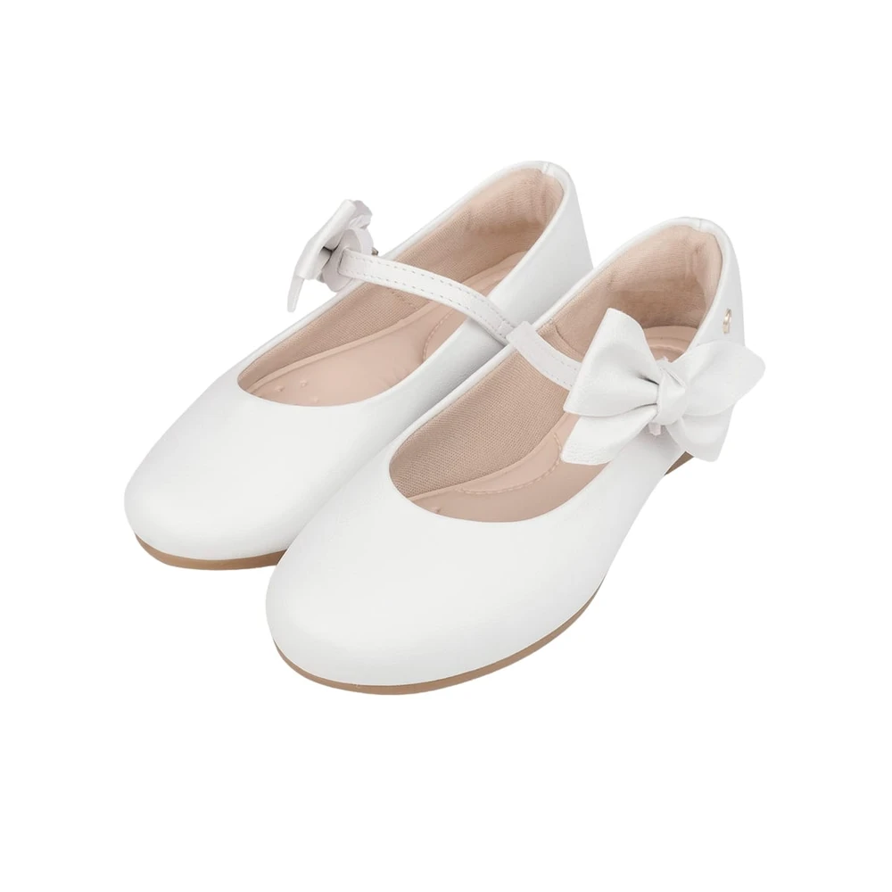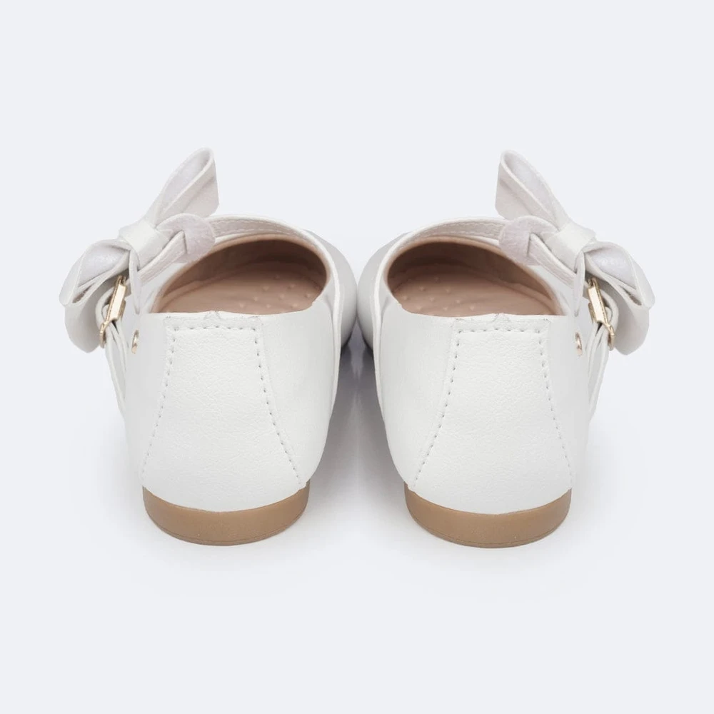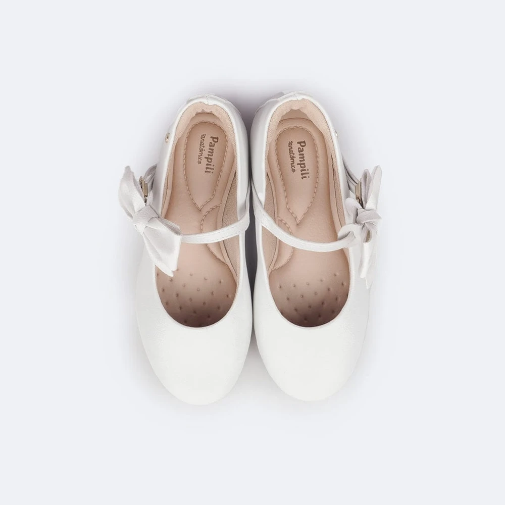 Sapato em sintético branco com laço na tira de fechamento, podendo ser usado de duas formas, com ou sem o laço! Sapato infantil forrado com tecido que absorve o suor e com forro no calcanhar. Sapato feminino com palmilha anatômica, confortável e flexível para cuidar do bem estar aos pezinhos. Sapatilha feminina com solado emborrachado antiderrapante, leve e flexível. Sapatilha infantil com fechamento em fivela sem pino, que facilita o calce, dando autonomia para as meninas.