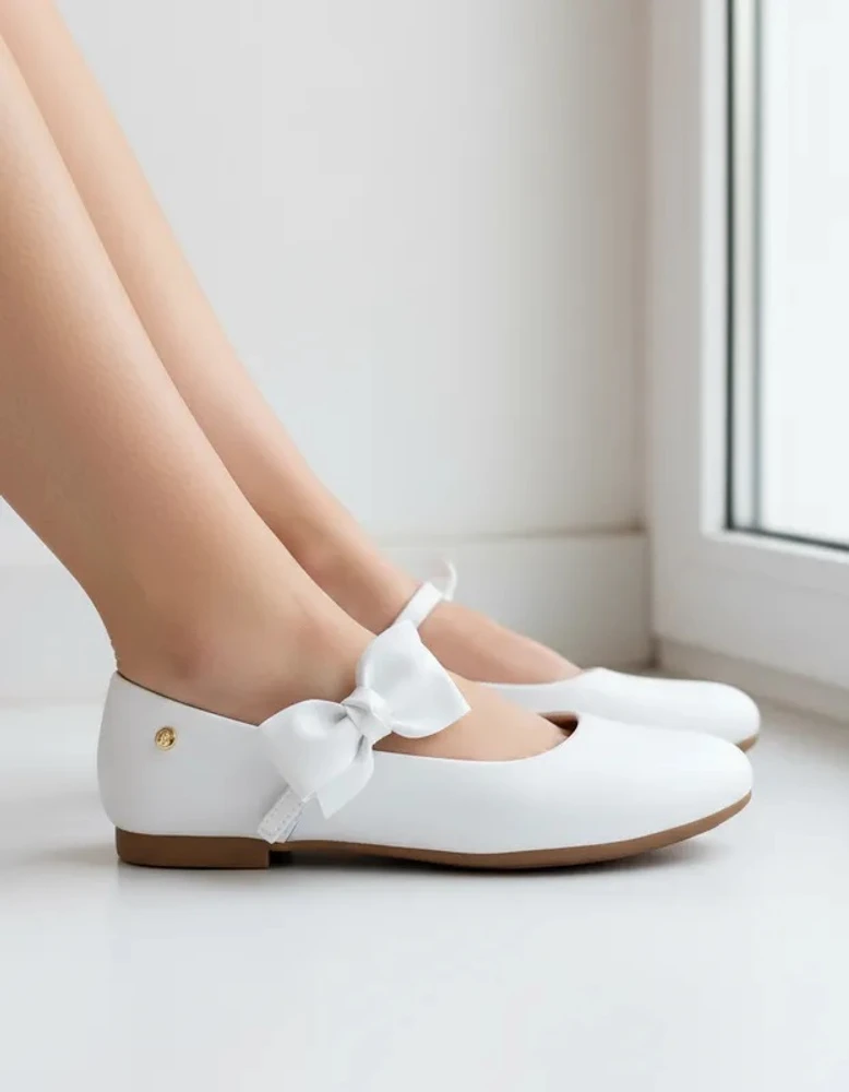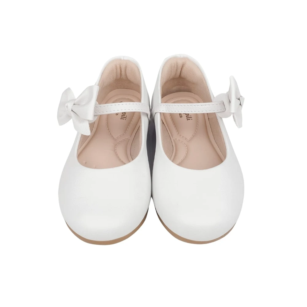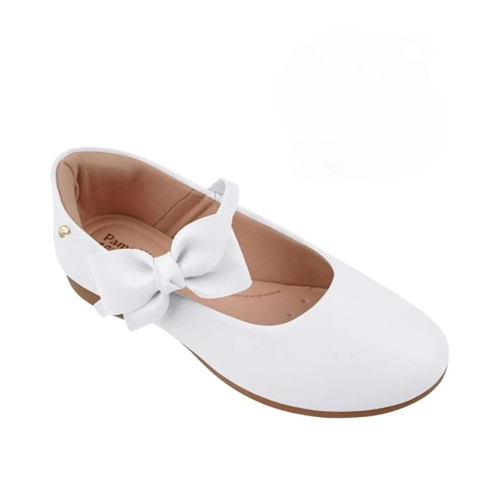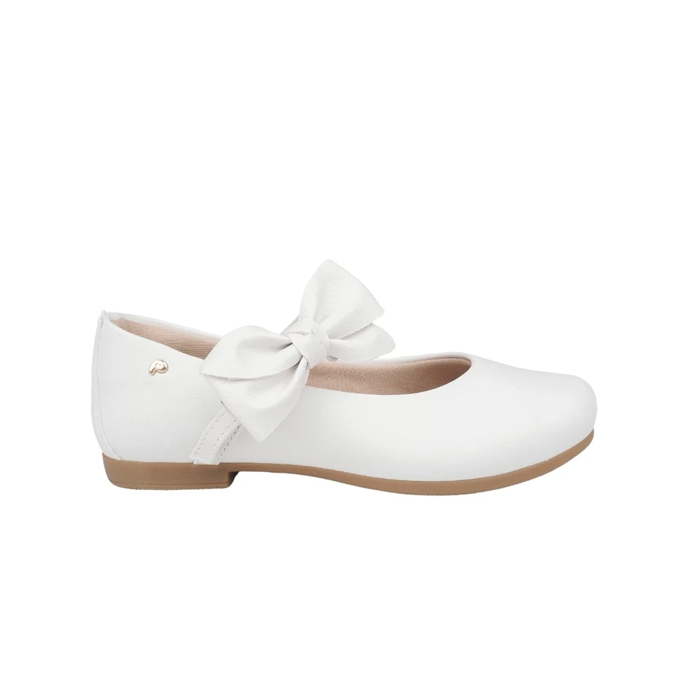 Sapato em sintético branco com laço na tira de fechamento, podendo ser usado de duas formas, com ou sem o laço! Sapato infantil forrado com tecido que absorve o suor e com forro no calcanhar. Sapato feminino com palmilha anatômica, confortável e flexível para cuidar do bem estar aos pezinhos. Sapatilha feminina com solado emborrachado antiderrapante, leve e flexível. Sapatilha infantil com fechamento em fivela sem pino, que facilita o calce, dando autonomia para as meninas.