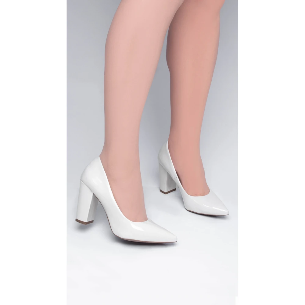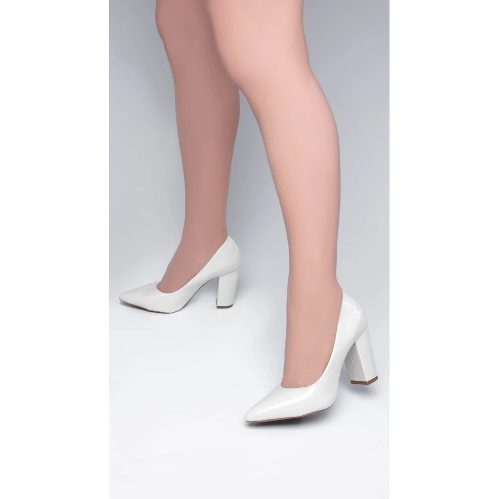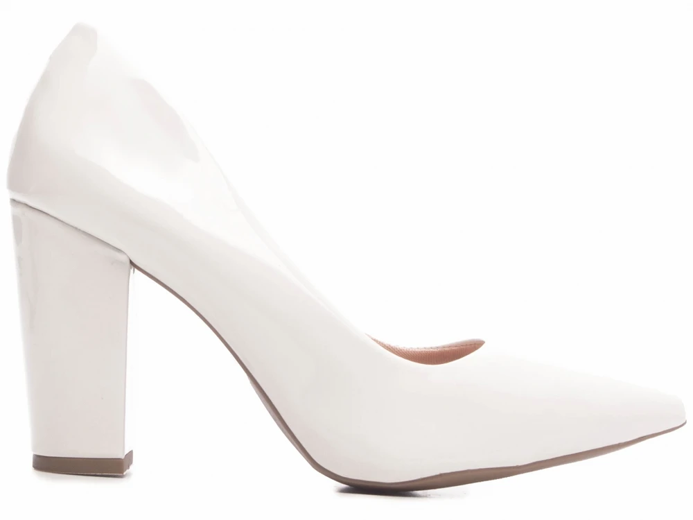 Material: Verniz Off White;Palmilha: Confort com 8 mm de Espessura, Espuma em EVA, Revestida com Verniz Off White e Taloneira Napa Bege;Forro: Cacharrel, material espumado para maior conforto, na cor bege claro;Salto: 8,5 cm de Altura encapado em Verniz Off White;Solado de PVC antiderrapante na cor Bege.