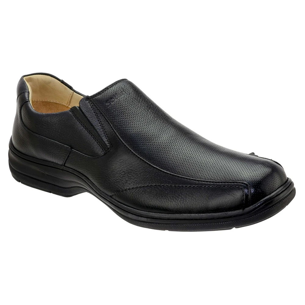 Sapato em couro com super sistema de amortecimento feito pela palmilha com pontos de massagem, formato anatômico e máxima leveza. E solado em borracha antiderrapante.