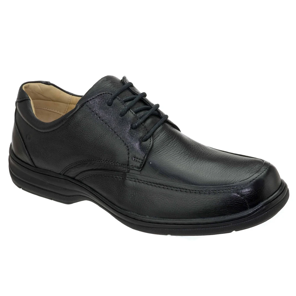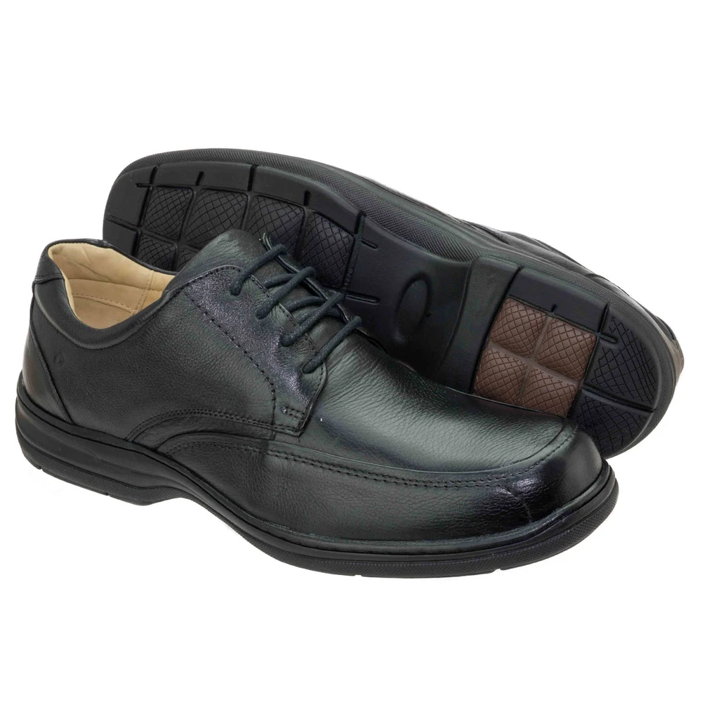 Sapato em couro com super sistema de amortecimento feito pela palmilha com pontos de massagem, formato anatômico e máxima leveza. E solado em borracha antiderrapante.