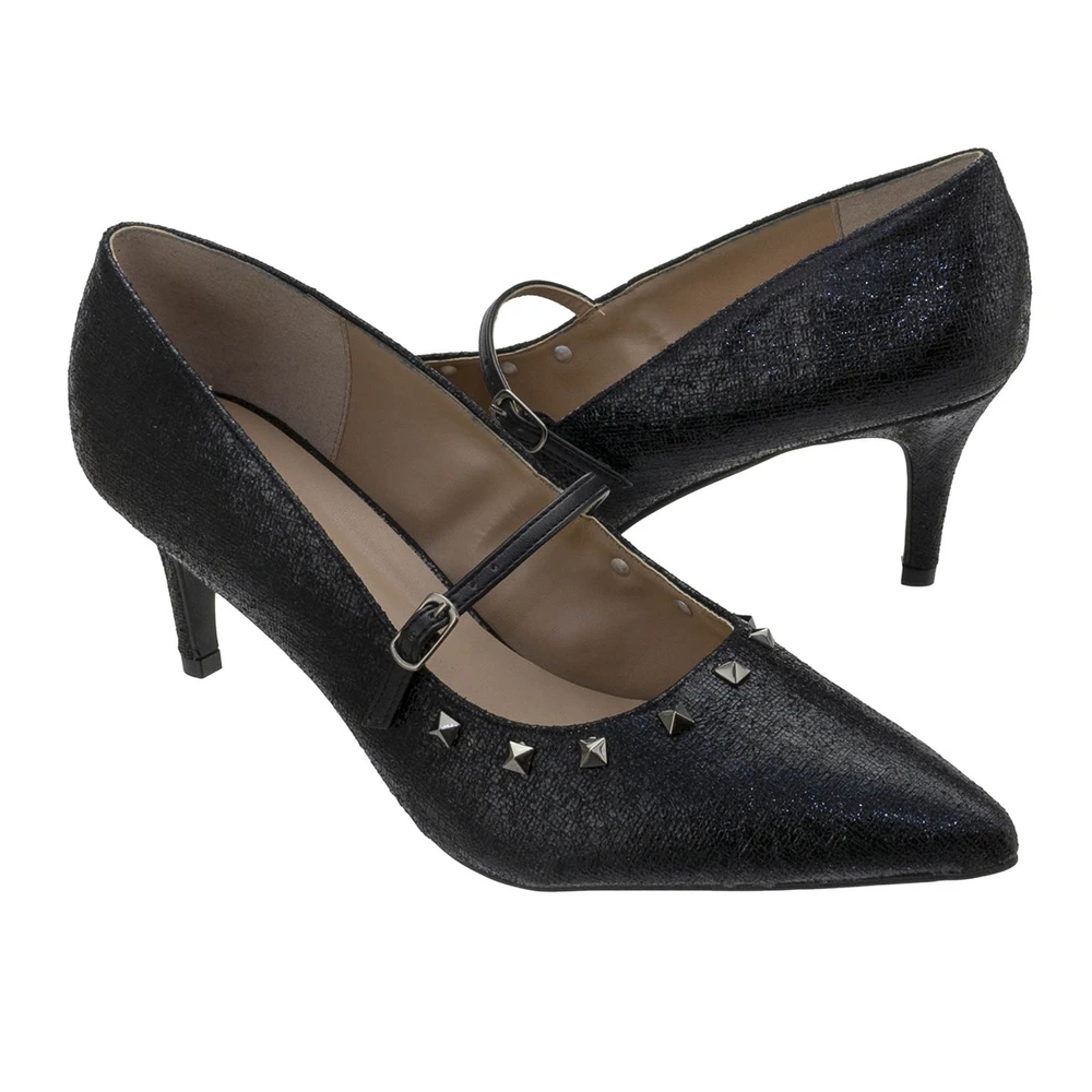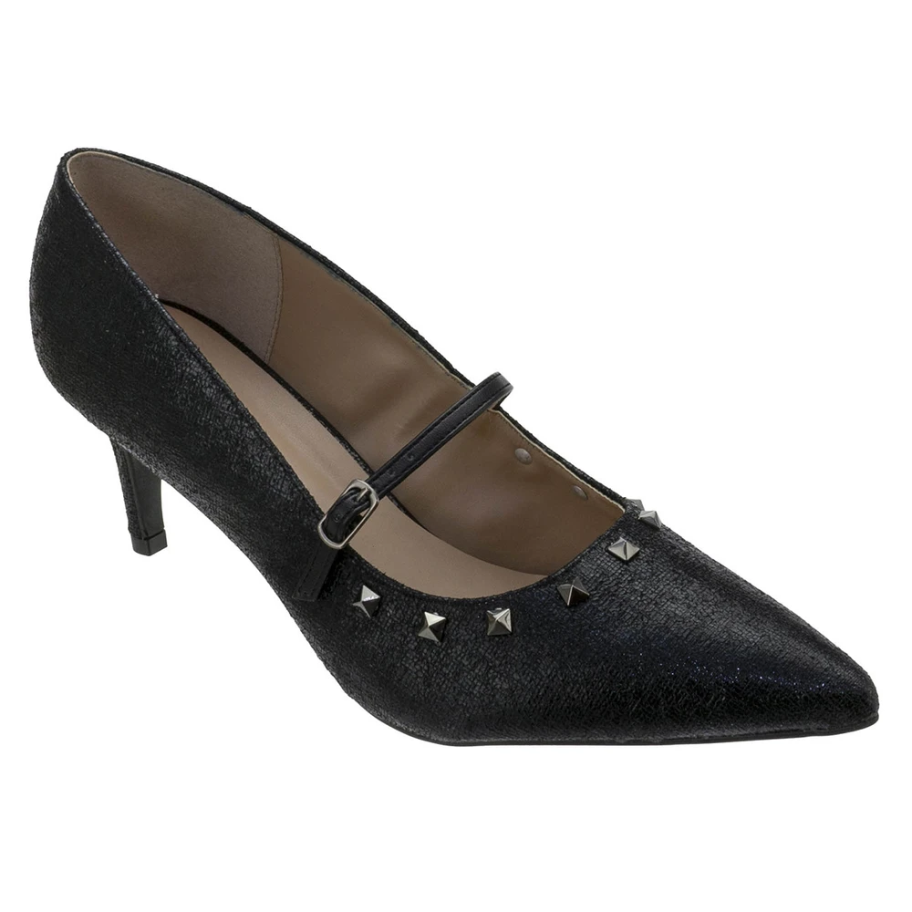 Scarpin em laminado sintético com saltinho fin de 7,5 cm de altura e solado em borracha antiderrapante.
