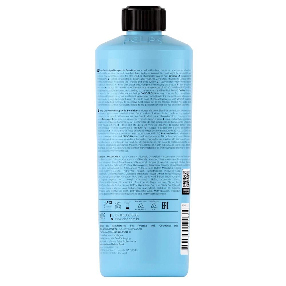 1 - Separe em quadrantes o cabelo limpo e seco. 2 - Com um Borrifador, aplique Ômega Zero Unique Nanoplastia a 1 centímetro da raiz, umedecendo comprimento e pontas de maneira uniforme. 3 - Deixe agir de 60 a 90 minutos (em cabelos muito resistentes). 4 - Enxague somente com água, retirando totalmente o produto. 5 - Escove o cabelo de maneira que fique bem alinhado. 6 - Pranche mechas finas de 10 a 15 vezes. 7 - Lave o cabelo como de costume, a partir de 1 dia após o procedimento.