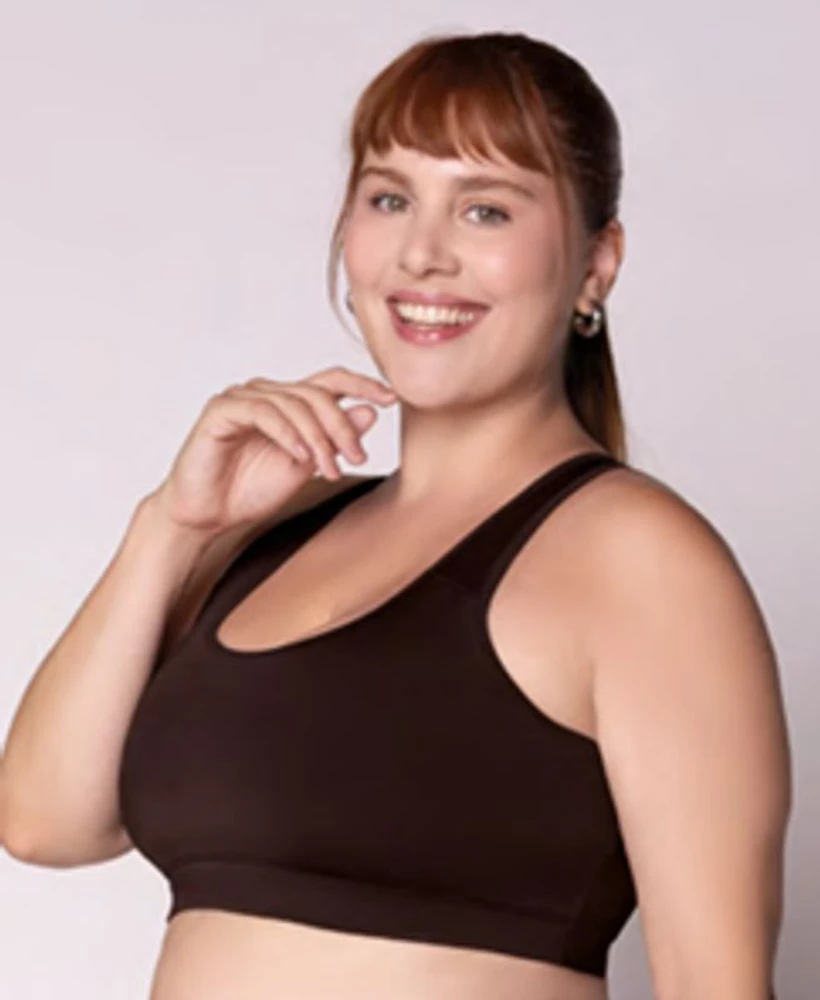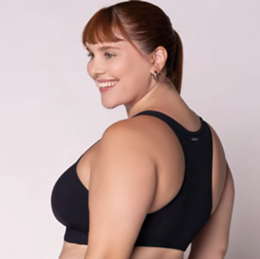 Design com alças largas e cós largo que oferece melhor suporte e sustentação sem apertar.