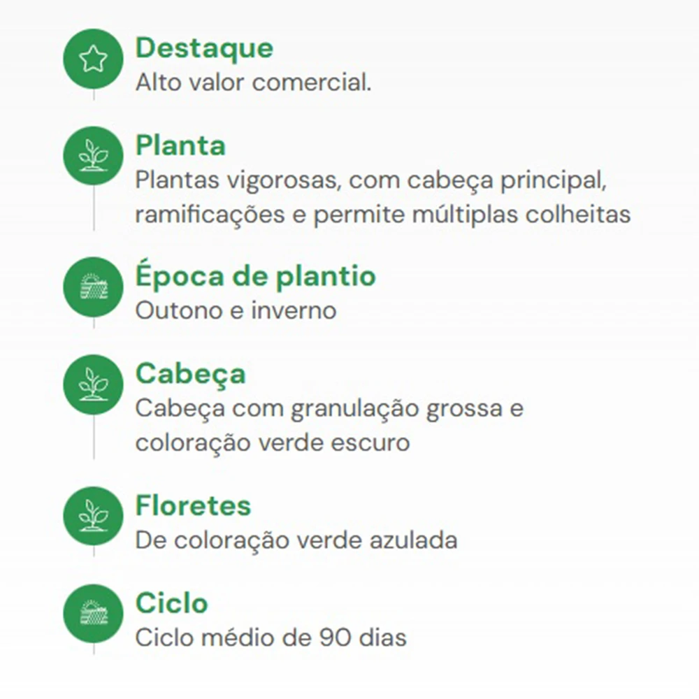 Brócolis do tipo ramoso de plantas vigorosas, com alto valor comercial, permite múltiplas colheitas e possui cabeça com granulação grossa.