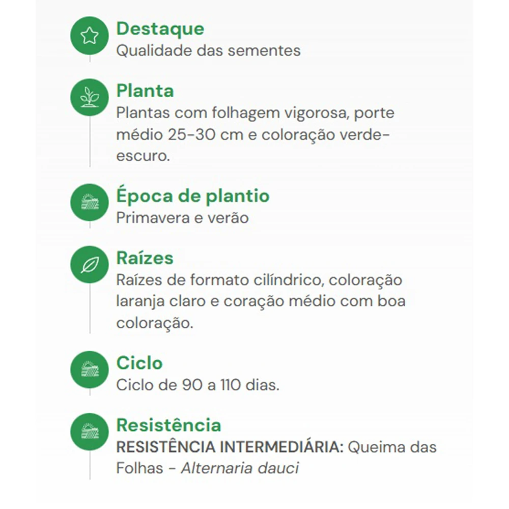Cenoura com raízes de formato cilíndrico, coloração laranja claro, coração médio com boa coloração, de porte médio (25-30 cm) e coloração verde-escuro. Tolerante. 90-110 dias.