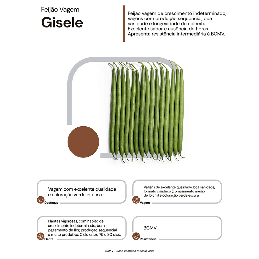 Feijão vagem de crescimento indeterminado, vagens com produção sequencial, boa sanidade e longevidade de colheita. Excelente sabor e ausência de fibras. Apresenta resistência intermediária à BCMV.