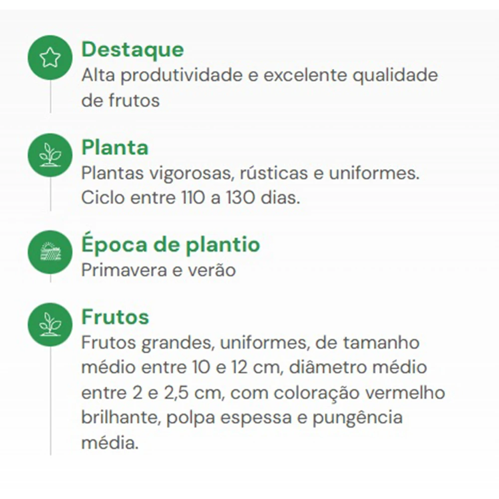 Frutos: grandes, uniformes, de tamanho médio entre 10 e 12 cm, diâmetro médio entre 2 e 2,5 cm, com coloração vermelho brilhante, polpa espessa e pungência média.