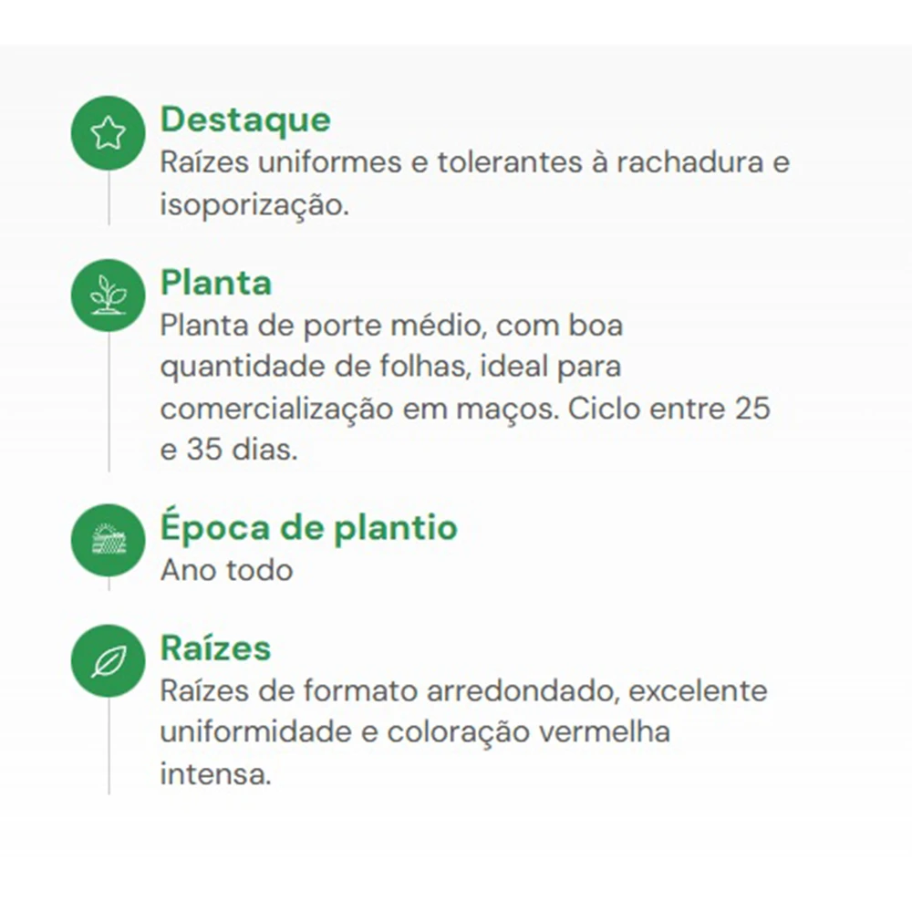 Rabanete híbrido, de planta vigorosa, muito uniformes e tolerantes à rachadura e isoporização.