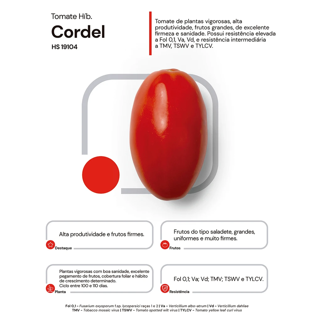 Tomate de plantas vigorosas, alta produtividade, frutos grandes, de excelente firmeza e sanidade. Possui resistência elevada a Fol 0,1, Va, Vd, e resistência intermediária a TMV, TSWV e TYLCV.