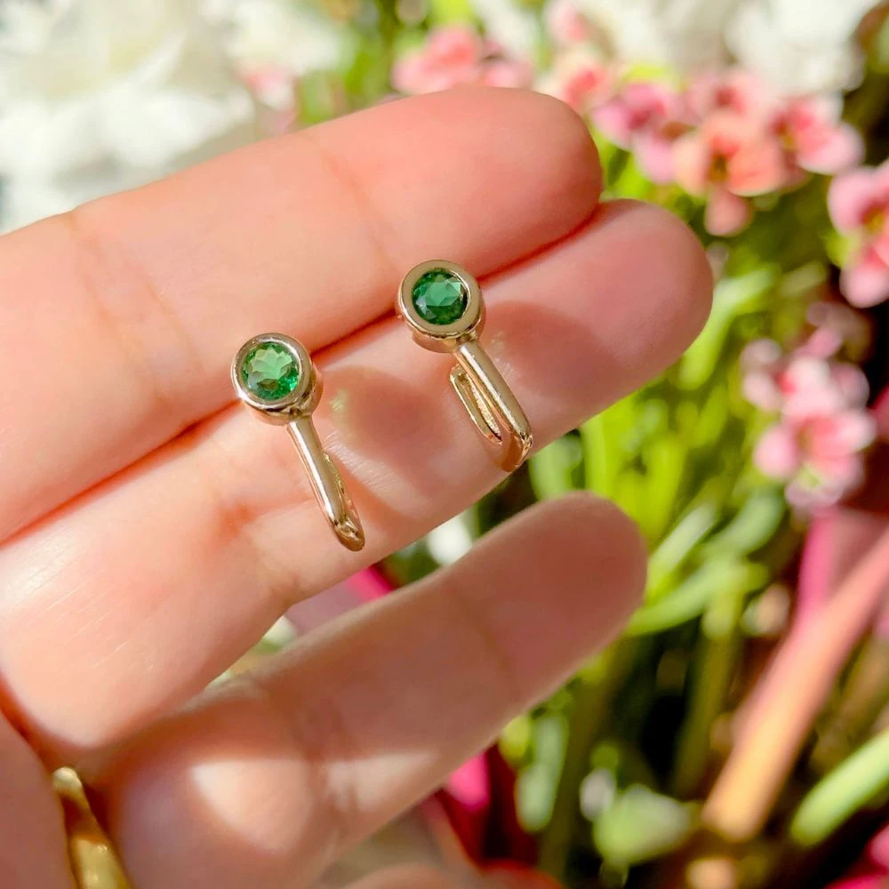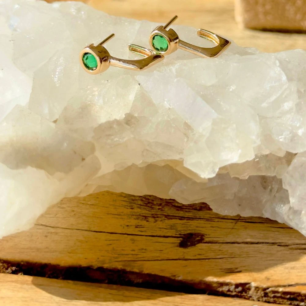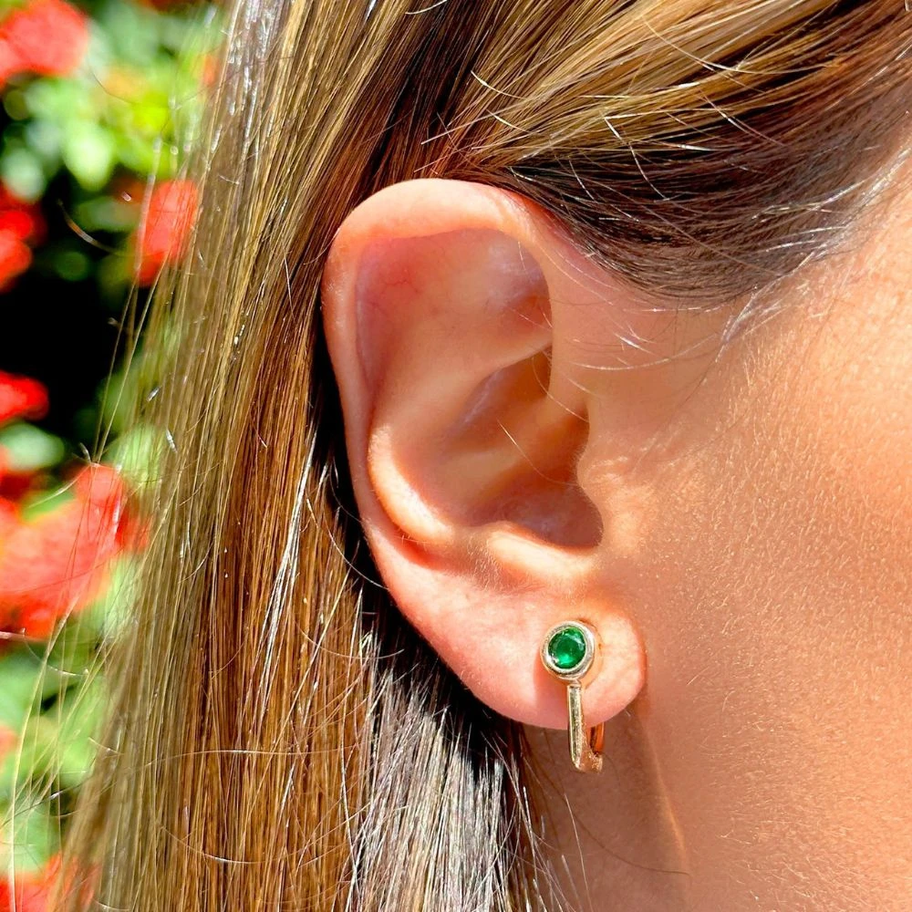 Brinco com cristal de zircônia esmeralda em forma redonda facetada na cravação inglesa que confere segurança e modernidade para peça;