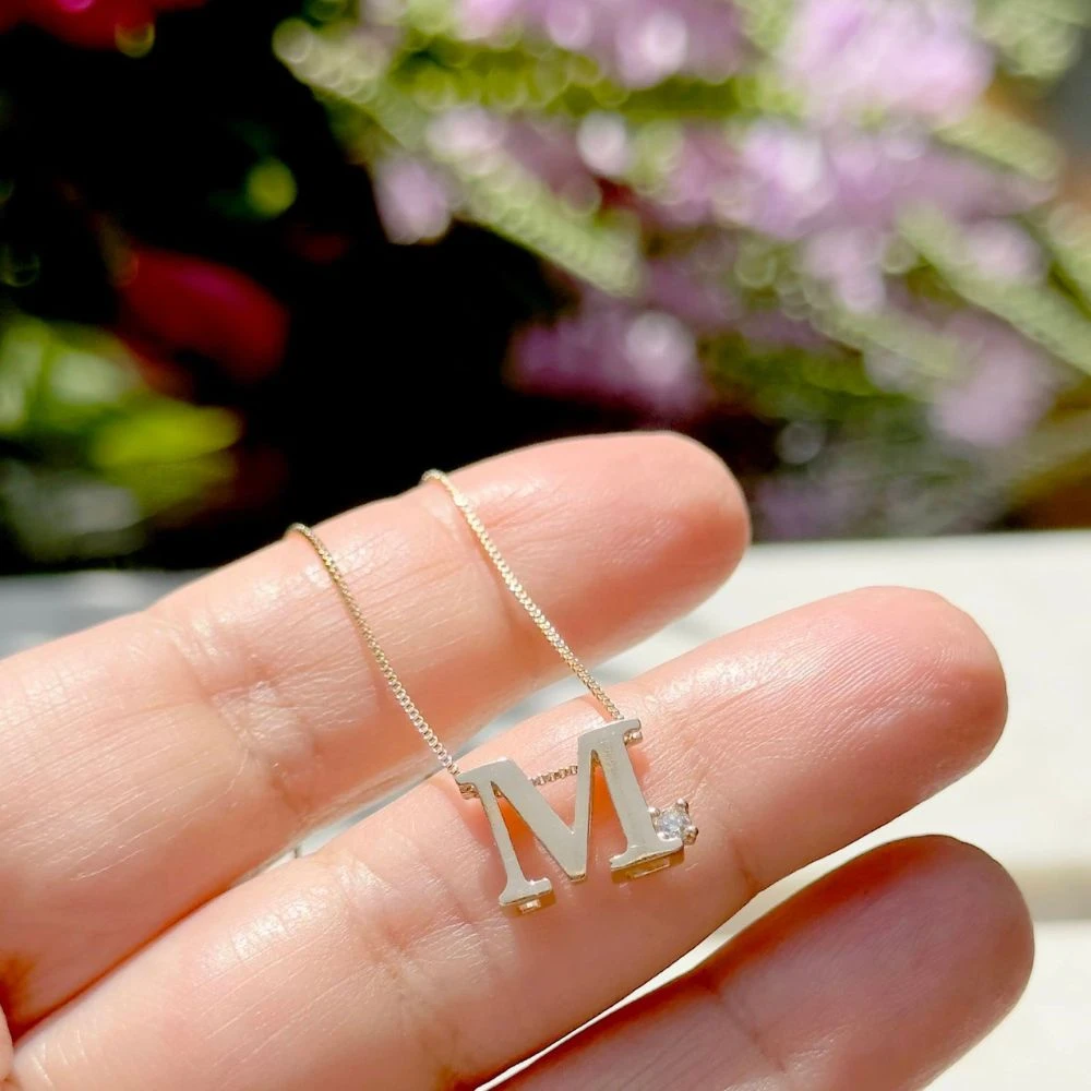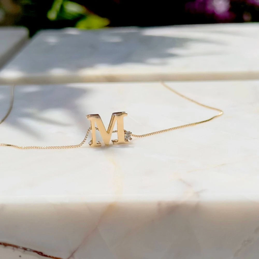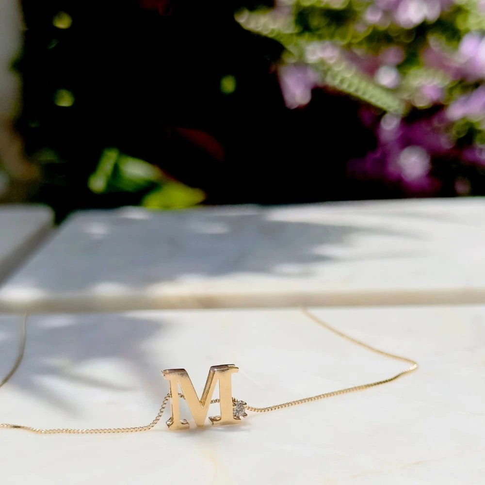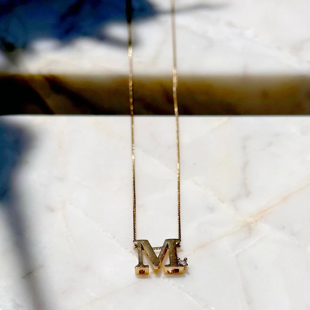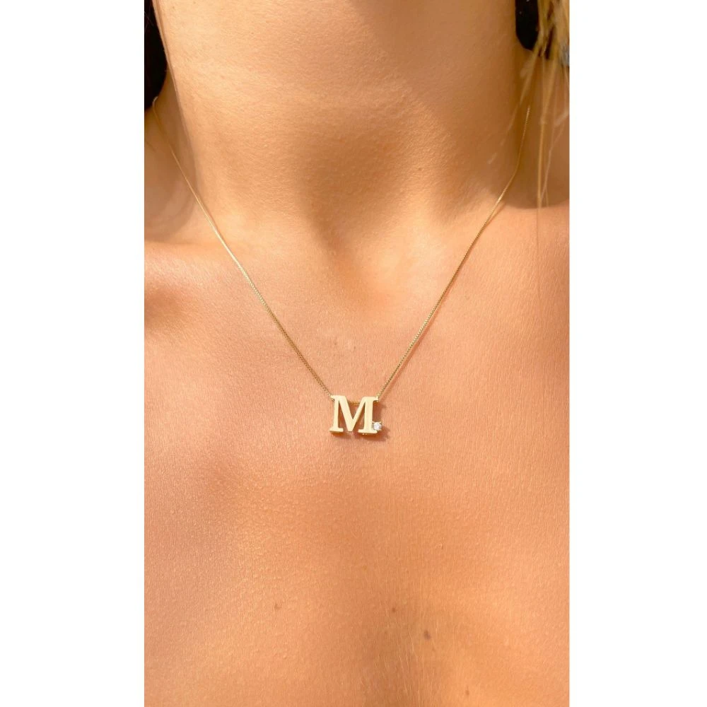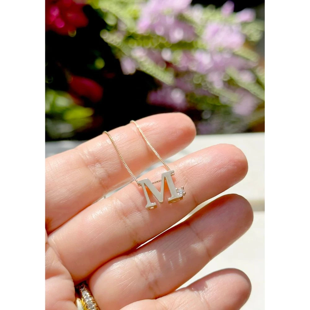 Medidas aproximadas: tamanho total do colar: 47 cm + 5 cm de extensão; tamanho da letra M: 1,5 cm;