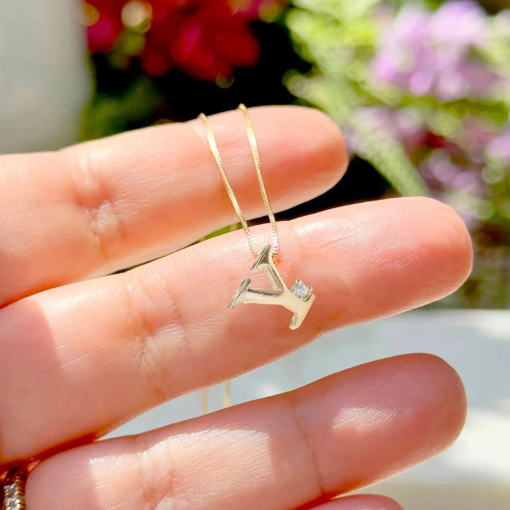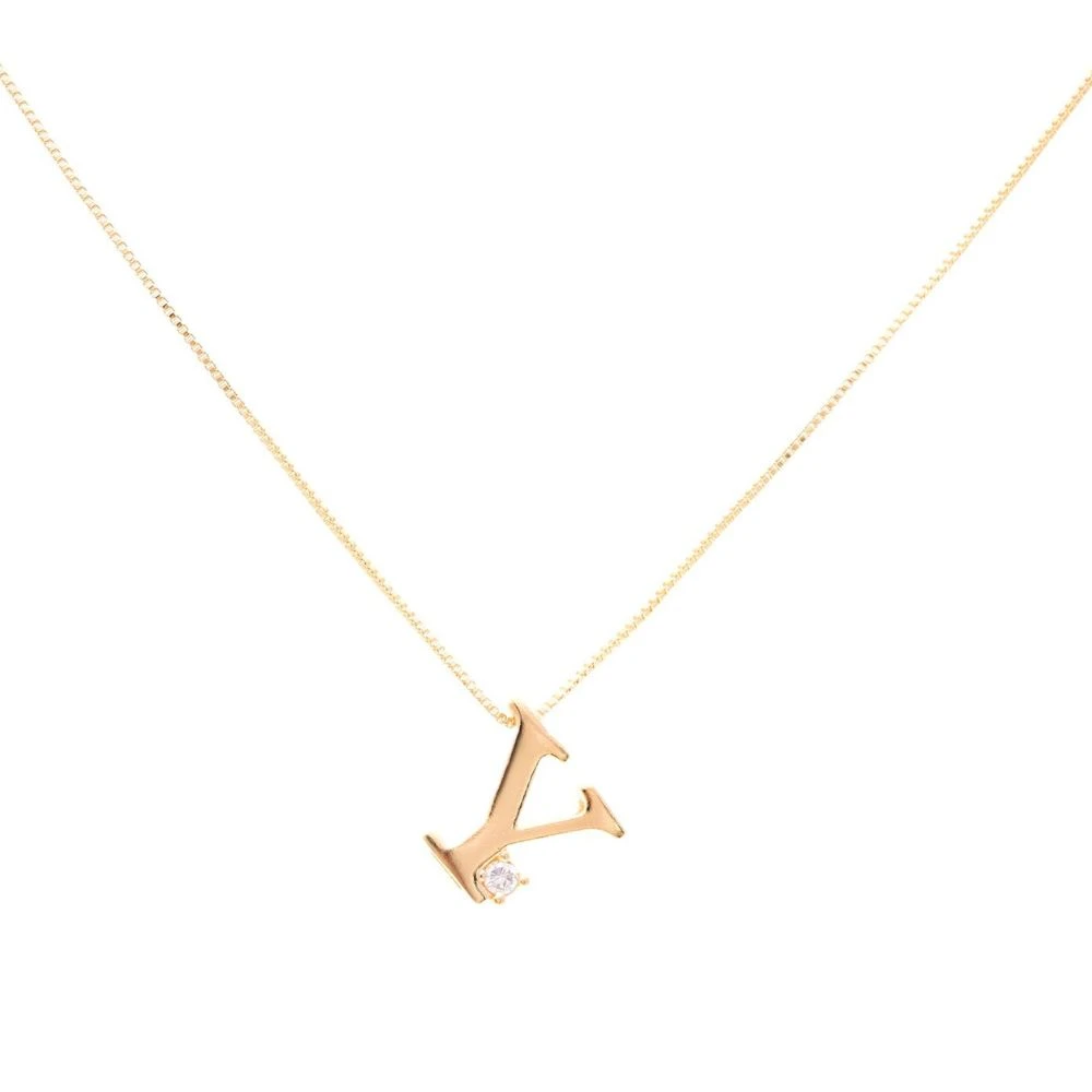 Colar feminino com pingente inicial da letra Y adornada por ponto de luz em cristal de zircônia branca cravejada e presa por garras;