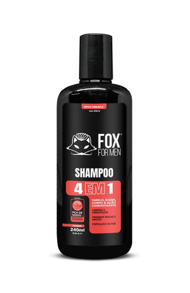 O SHAMPOO 4 EM 1 DA FOX FOR MEN, foi desenvolvido para utilizar nos cabelo, barba e corpo. Ativado com extrato de mandioca, que fortalece e auxilia no crescimento do fios saudáveis. Já o PCA de sódio, confere hidratação profunda e umectante para os cabelos, barba e corpo.