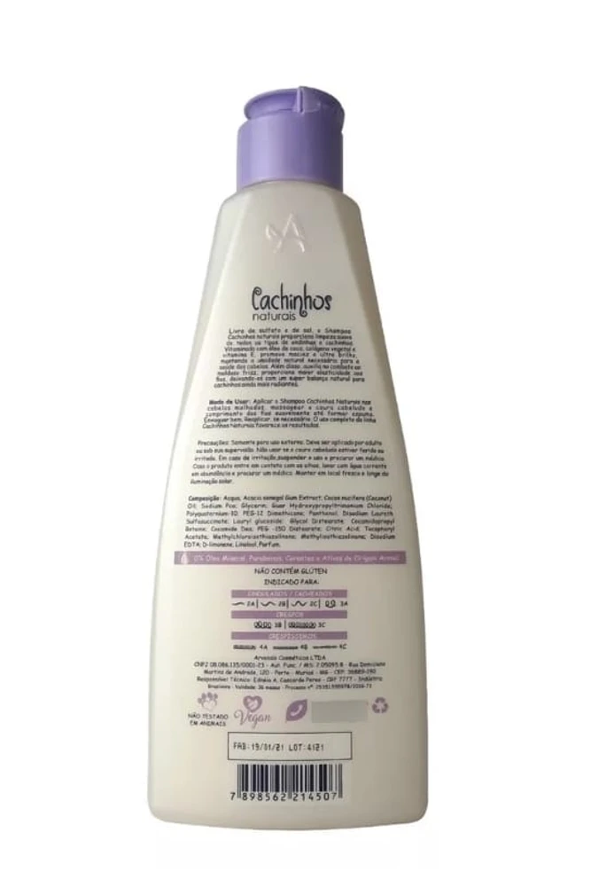 Desenvolvido com uma formulação livre de sulfato e de sal, o shampoo Cachinhos Naturais é especial para a limpeza suave de todos os tipos de cabelos cacheados. (300mL) - Sem Sal - pH 5,0 - 6,0 (LOW POO)
