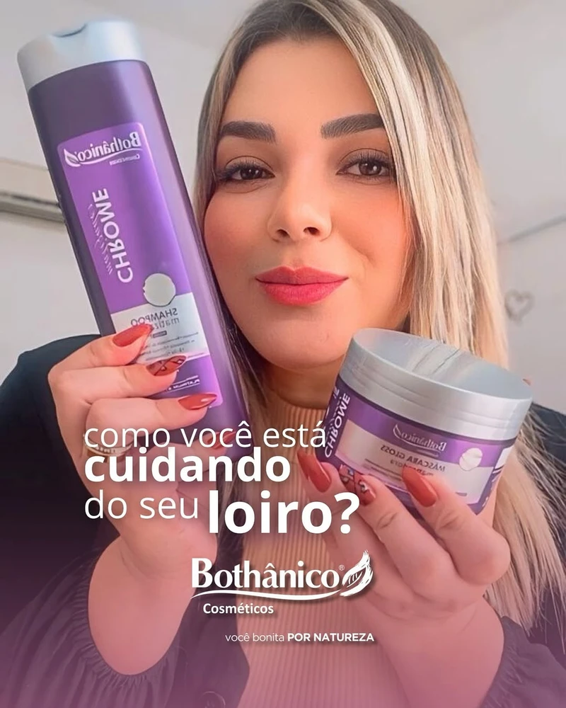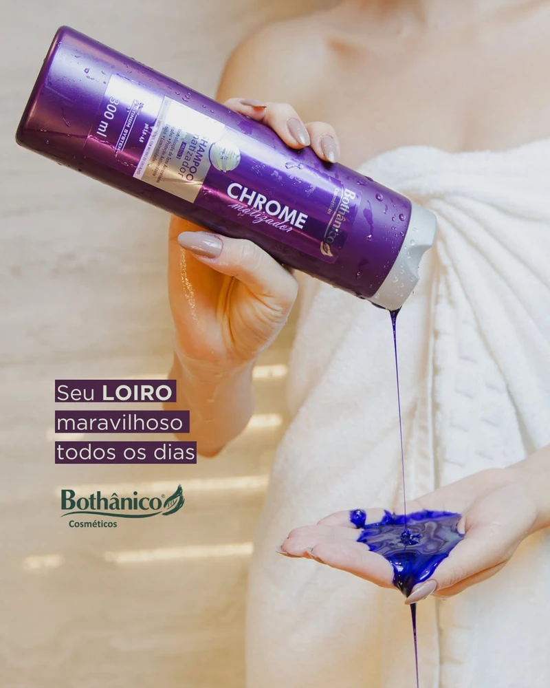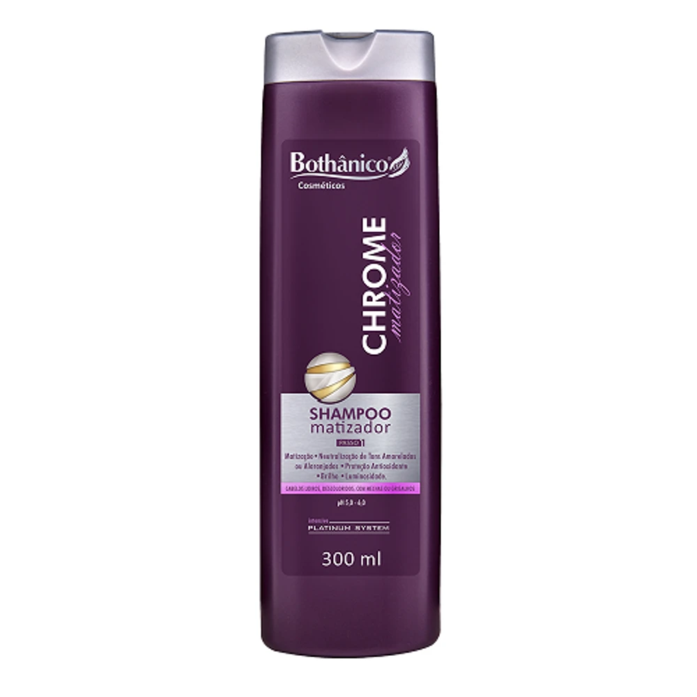 A Bothânico Expertise desenvolveu a linha CHROME MATIZADOR para matização imediata dos fios loiros, descoloridos, com mechas ou grisalhos, promovendo a neutralização dos indesejados tons amarelados e alaranjados. O PLATINUM SYSTEM possui ação antioxidante que promove uma barreira contra a oxidação da cor dos fios e a deposição imediata de pigmentos especiais em sua superfície, para um efeito matizador incrível.