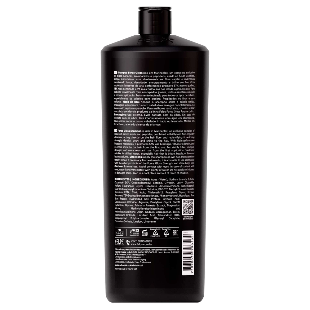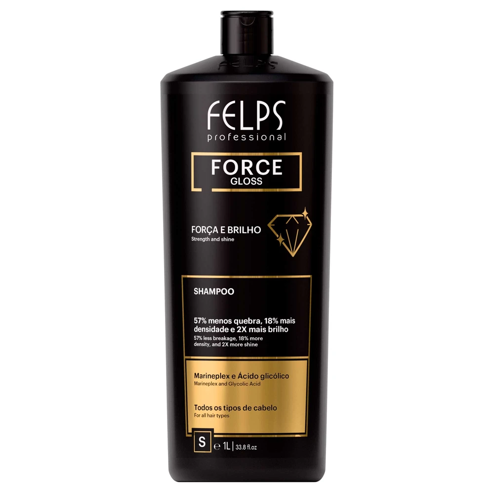 Shampoo Force Gloss rico em Marineplex, um complexo exclusivo de algas marinhas, aminoácidos e peptídeos, aliado ao Ácido Glicólico. Limpa suavemente, atua diretamente na fibra capilar e redensifica devolvendo força, densidade, encorpamento e brilho aos fios. Com moléculas bioativas de alta performance promove 57% menos quebra, 18% mais densidade e 2X mais brilho aos fios desde o primeiro uso. Para cabelos visivelmente mais encorpados, jovens, fortes e resistentes desde a primeira aplicação. Tratamento indicado para todos os tipos de cabelo, especialmente os cabelos com quebra, fragilizados ou finos e sem volume.