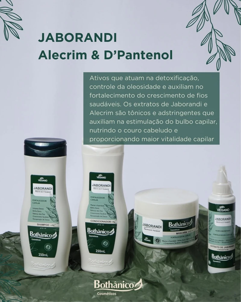 Fórmula desenvolvida para hidratar profundamente, revitalizar e fortalecer os cabelos fracos. Estimula o crescimento e auxilia no tratamento antiqueda e anticaspa. Os Extratos de Jaborandi e Alecrim são tônicos e adstringentes capilares que estimulam a circulação no couro cabeludo, garantindo maior vitalidade capilar.