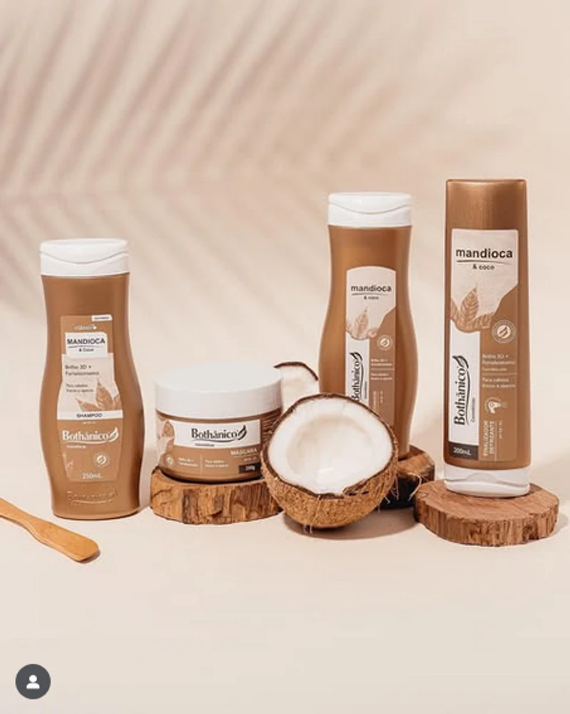 A Mandioca, rica em minerais e vitaminas e o óleo de coco, poderoso umectante e nutritivo auxiliam no crescimento e fortalecimento dos cabelos. A linha Mandioca & Coco ainda possui ativos que proporcionam força e brilho 3D espelhado aos fios.