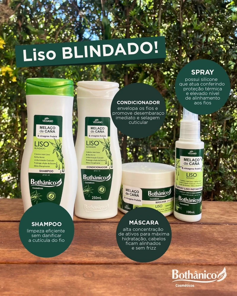 Desenvolvida especialmente para quem busca fios mais alinhados, com brilho intenso e sem frizz, a linha Liso Blindado une a força hidratante do Melaço de Cana com o poder disciplinante dos Vinagres Frutais. Essa combinação exclusiva trata profundamente os fios, prolonga o efeito liso e protege contra danos térmicos — sem recorrer a química.