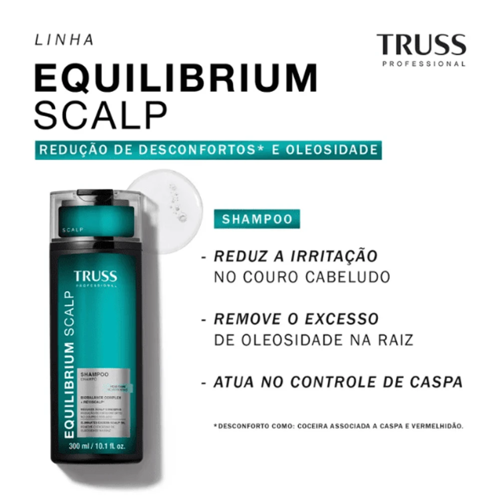 Descubra o poder do Shampoo Truss Equilibrium Scalp 300ml, desenvolvido especialmente para quem busca equilíbrio e saúde no couro cabeludo. Este shampoo profissional atua na redução da oleosidade excessiva na raiz, proporcionando uma sensação de frescor e bem-estar duradouros. Com fórmula avançada contendo o complexo Biobalance e Reviscalp, ele reduz irritações comuns, como coceira e vermelhidão, e controla a caspa, garantindo um couro cabeludo limpo e saudável.