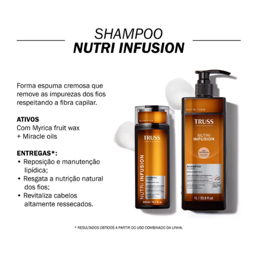 O Shampoo Truss Nutri Infusion foi desenvolvido para promover uma limpeza eficiente sem ressecar os fios, garantindo nutrição e hidratação desde a primeira lavagem. Com uma fórmula avançada enriquecida com ativos poderosos, ele repõe os nutrientes essenciais, fortalece a fibra capilar e restaura o brilho e a maciez dos cabelos. Ideal para cabelos ressecados, danificados ou quimicamente tratados, proporcionando fios mais saudáveis e revitalizados.