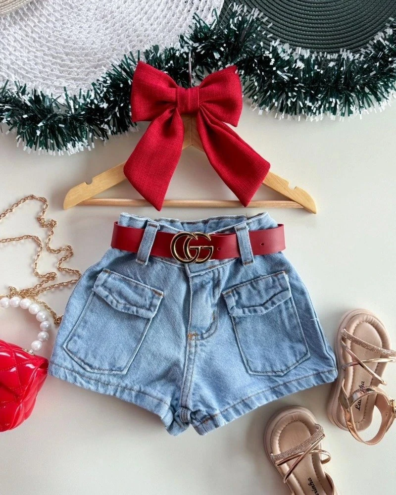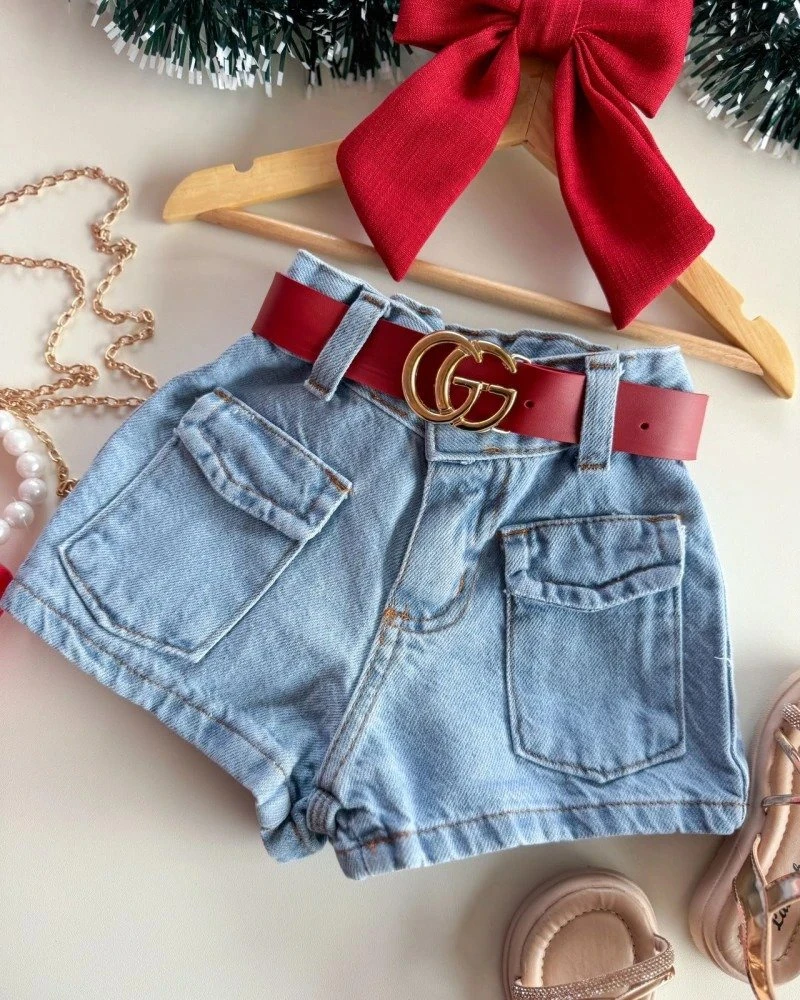 O Short Jeans com bolso e cinto vermelho é a peça perfeita para deixar sua filha ainda mais estilosa e confortável. Feito com tecido de alta qualidade, ele é resistente e durável, ideal para acompanhar as aventuras das crianças.