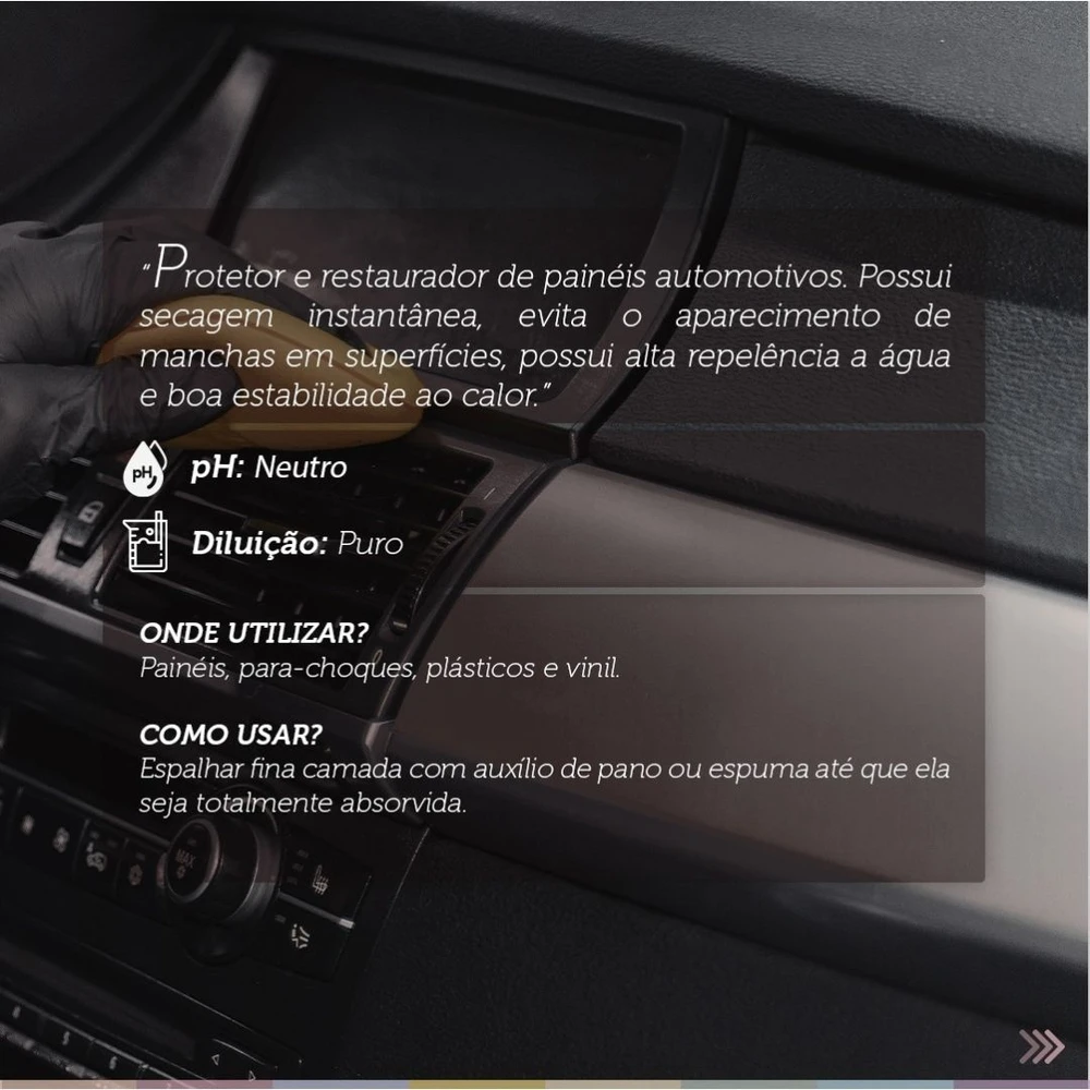 Protetor e restaurador de painéis automotivos. Possui secagem instantânea, evita o aparecimento de manchas em superfícies, possui alta repelência a água e boa estabilidade ao calor.