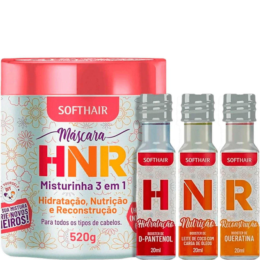 A linha HNR Soft Hair é composta por uma Máscara e três ampolas (boosters): H (Hidratação), N (Nutrição) e R (Reconstrução). Foi especialmente desenvolvida para potencializar o resultado do seu cronograma.