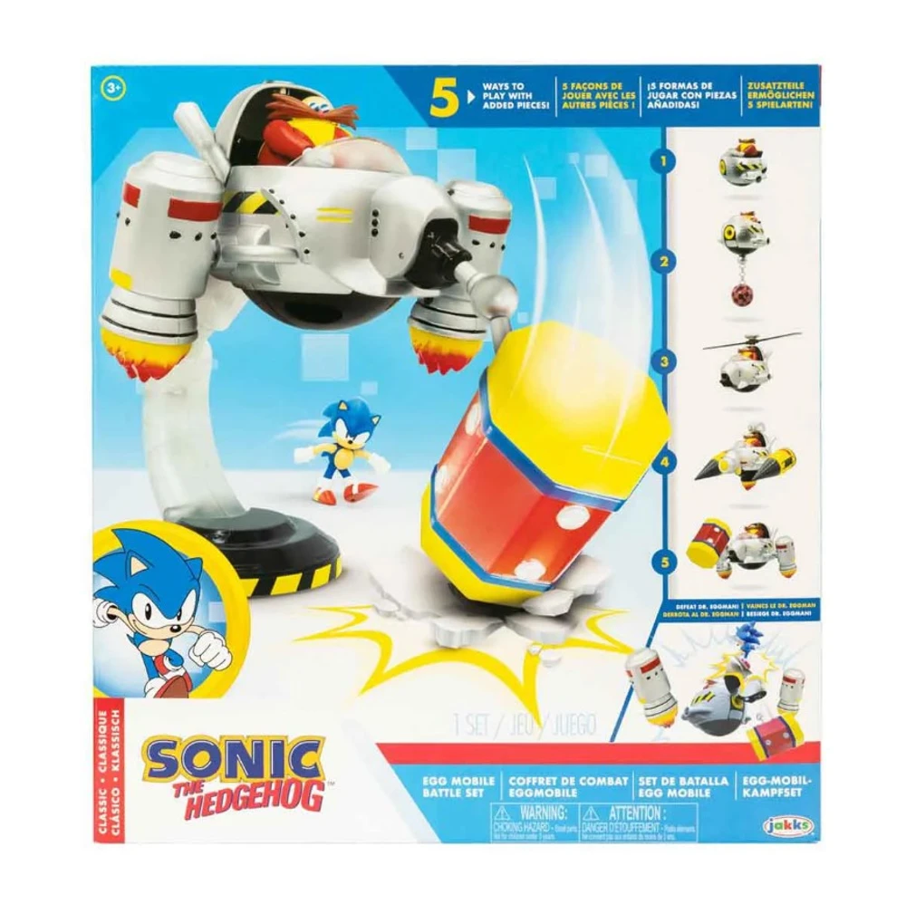 Recrie ou reproduza as batalhas clássicas dos videogames de Sonic the Hedgehog! Derrote o Dr. Eggman e o Egg Mobile com um golpe direto no para-brisa. Assim que o Egg Mobile for derrotado, monte-o novamente com uma configuração diferente para jogar tudo de novo. O Egg Mobile tem acessórios para o Egg Helicopter, Egg Digger, Egg Wrecker e Egg Hammer. Inclui também 2 bonecos do Sonic e Dr. Eggman.