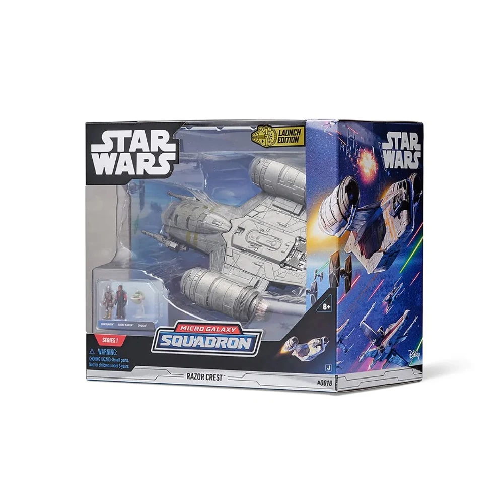 O veículo também inclui micro figuras articuladas do Mandalorian, Greef Karga e Grogu - compatível com qualquer nave Star Wars Micro Galaxy Squadron."