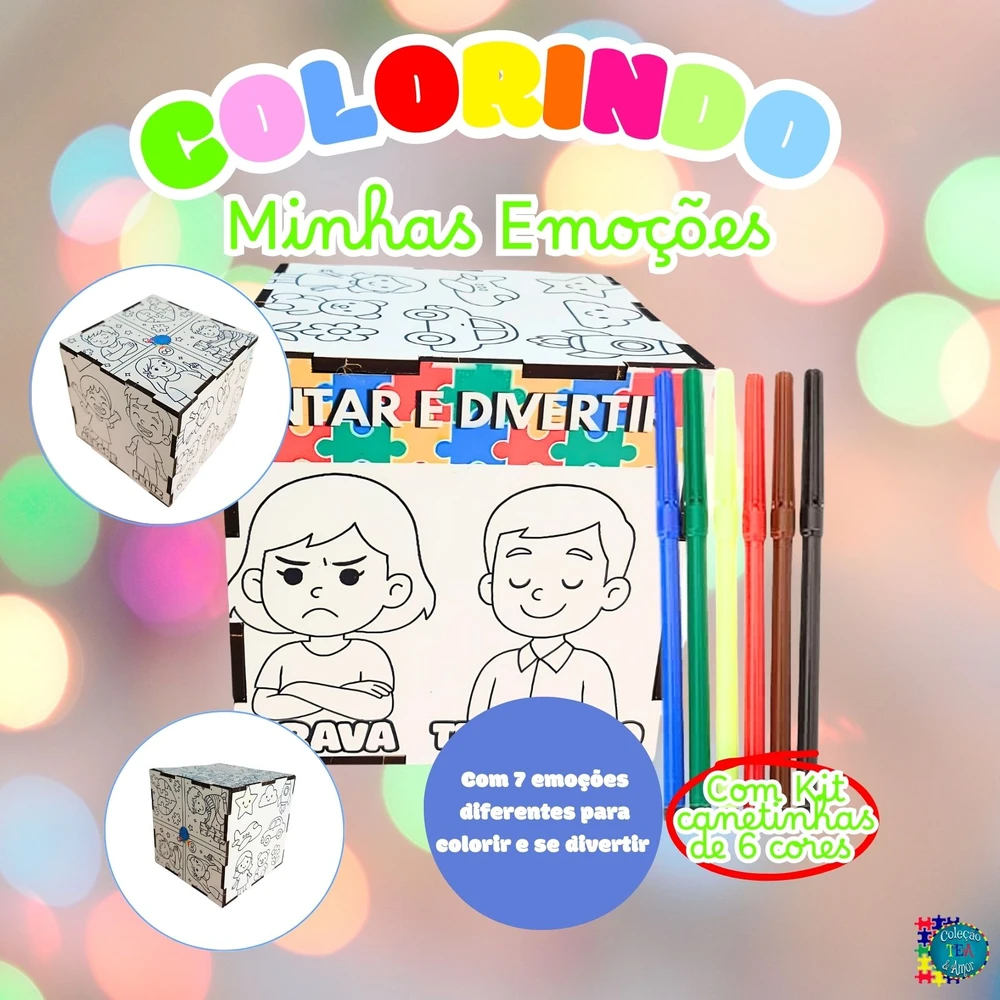 Fabricado em MDF resistente e seguro, o cubo apresenta seis faces ilustradas com emoções básicas.. Os desenhos têm traços simples, expressivos e amigáveis, perfeitos para serem coloridos com as canetinhas inclusas. Ao pintar cada emoção, a criança desenvolve habilidades como coordenação motora fina, foco e criatividade, enquanto aprende a reconhecer, identificar e expressar sentimentos que muitas vezes ainda não consegue verbalizar com facilidade.