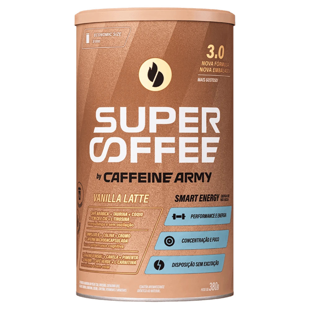 SuperCoffee 3.0 Vanilla Latte 380g Caffeine Army é a escolha ideal para quem busca energia limpa e foco duradouro. Com fórmula avançada que combina café arábica, taurina, coQ10, vitaminas do complexo B, colina e cromo, oferece performance física e cognitiva sem oscilações. Sua composição inclui ainda ingredientes termogênicos naturais como canela, pimenta e café verde, que impulsionam o metabolismo e promovem disposição constante, sem excitação. Perfeito para quem deseja concentração máxima no trabalho ou treinos intensos, mantendo o bem-estar ao longo do dia. Com 380g, rende até 30 doses, garantindo praticidade e economia. Experimente o equilíbrio entre sabor Vanilla Latte e energia inteligente que só o SuperCoffee 3.0 proporciona.