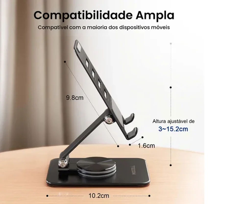 Além de elegante e prático, o suporte é fácil de transportar e possui uma base de apoio que evita quedas e escorregões. Garanta conforto e segurança ao usar seus dispositivos, seja para trabalho ou lazer!