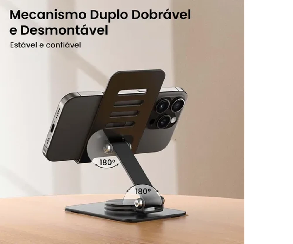 O design do suporte é todo feito em metal resistente, garantindo durabilidade e segurança, especialmente com seu encaixe maior, que oferece suporte firme para diferentes tamanhos de aparelhos. Seja em casa, no trabalho ou para vidas e gravações, ele oferece o ajuste ideal para o ângulo perfeito, sem preocupações.