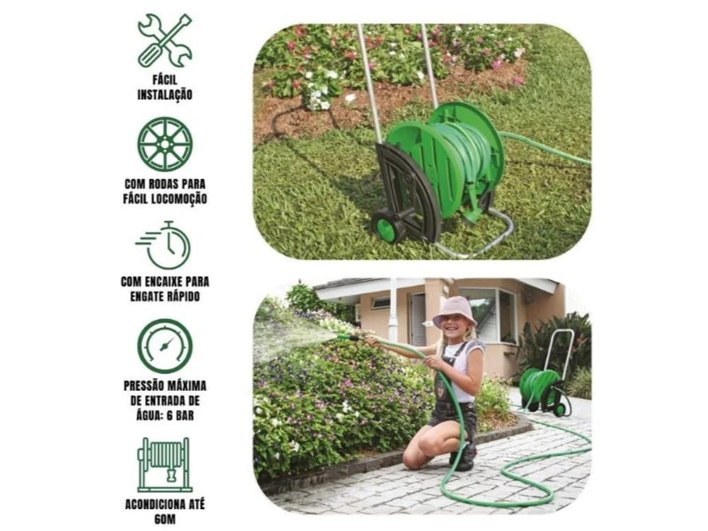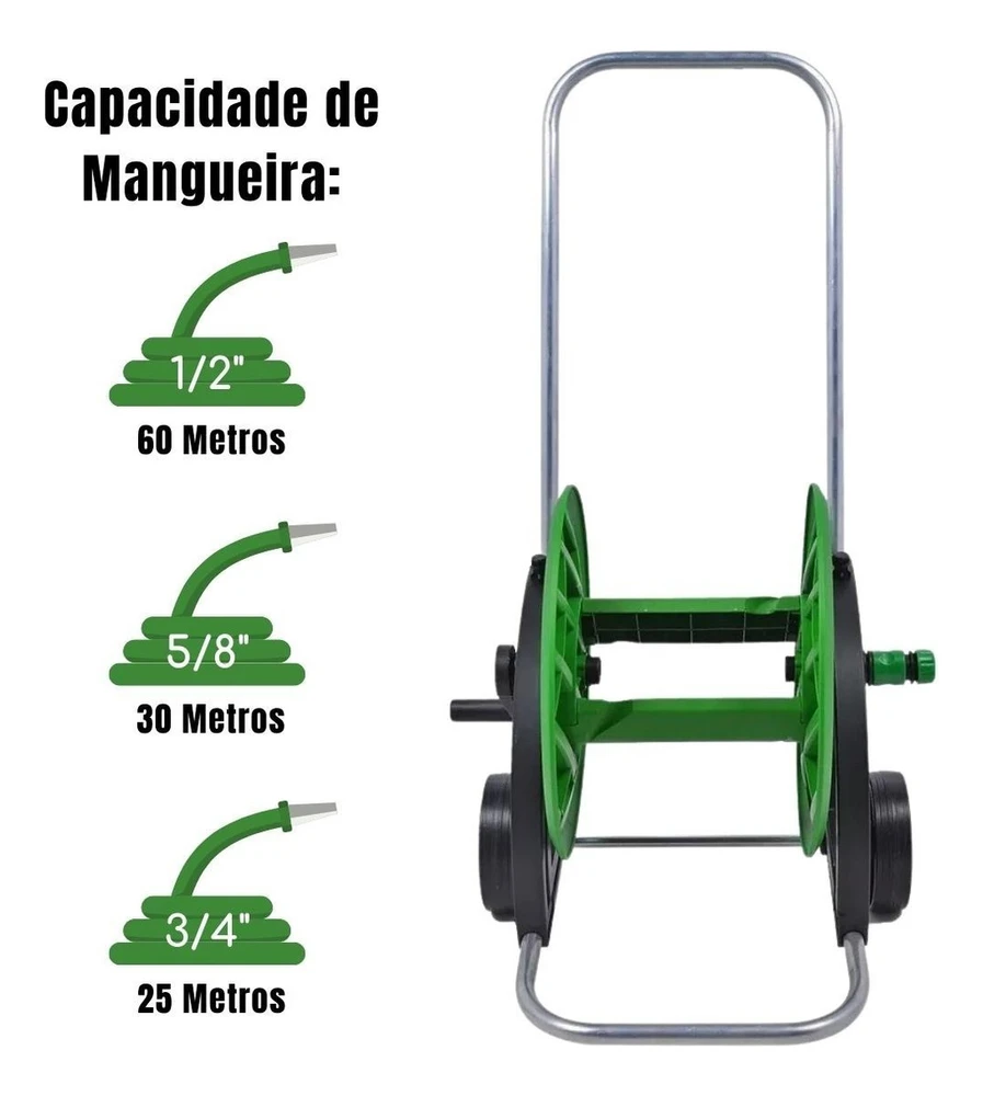 Com capacidade para armazenar até 50 metros de mangueira de 1/2", 30 metros de 5/8" ou 25 metros de 3/4", permite um fácil enrolamento e desdobramento, evitando dobras e prolongando a vida útil da mangueira. Ideal para quem busca uma solução funcional e de longa durabilidade para cuidados com o jardim.