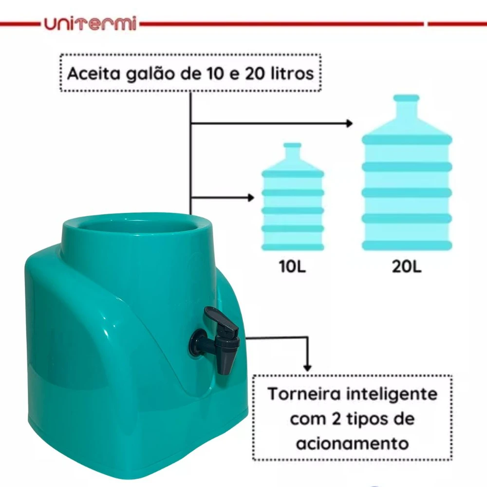 O suporte é compatível com galões de água mineral de 10 e 20 litros, oferecendo versatilidade para atender às suas necessidades. Basta encaixar o galão no suporte e você estará pronto para desfrutar de água fresca e pura.